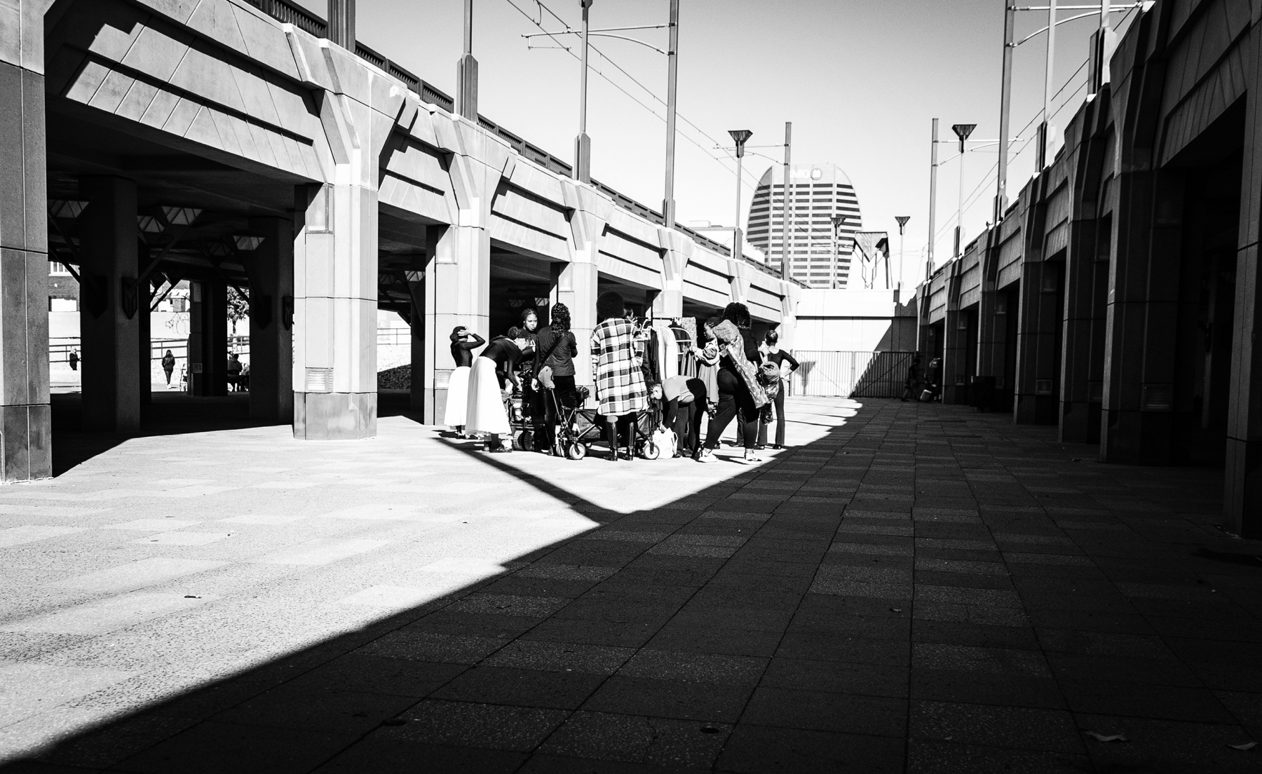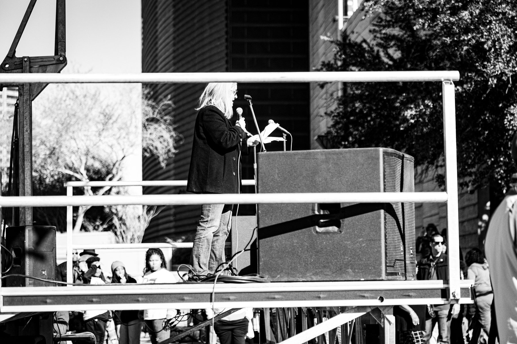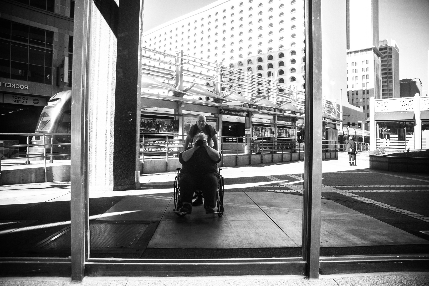This year, on Martin Luther King Jr. day, my dear husband took me on a downtown walkabout to try dipping my toes into the waters of street photography. I have done but little of this kind of thing for a number of reasons. For one thing, I am fairly immobilized these days due to pain and require assistance to get around in a wheelchair. For another, I am not what one could call “inconspicuous” – and it’s always been my feeling that street photography requires a subtlety that eludes me. However, I wanted to try, and Paul always enjoys going downtown so off we went.