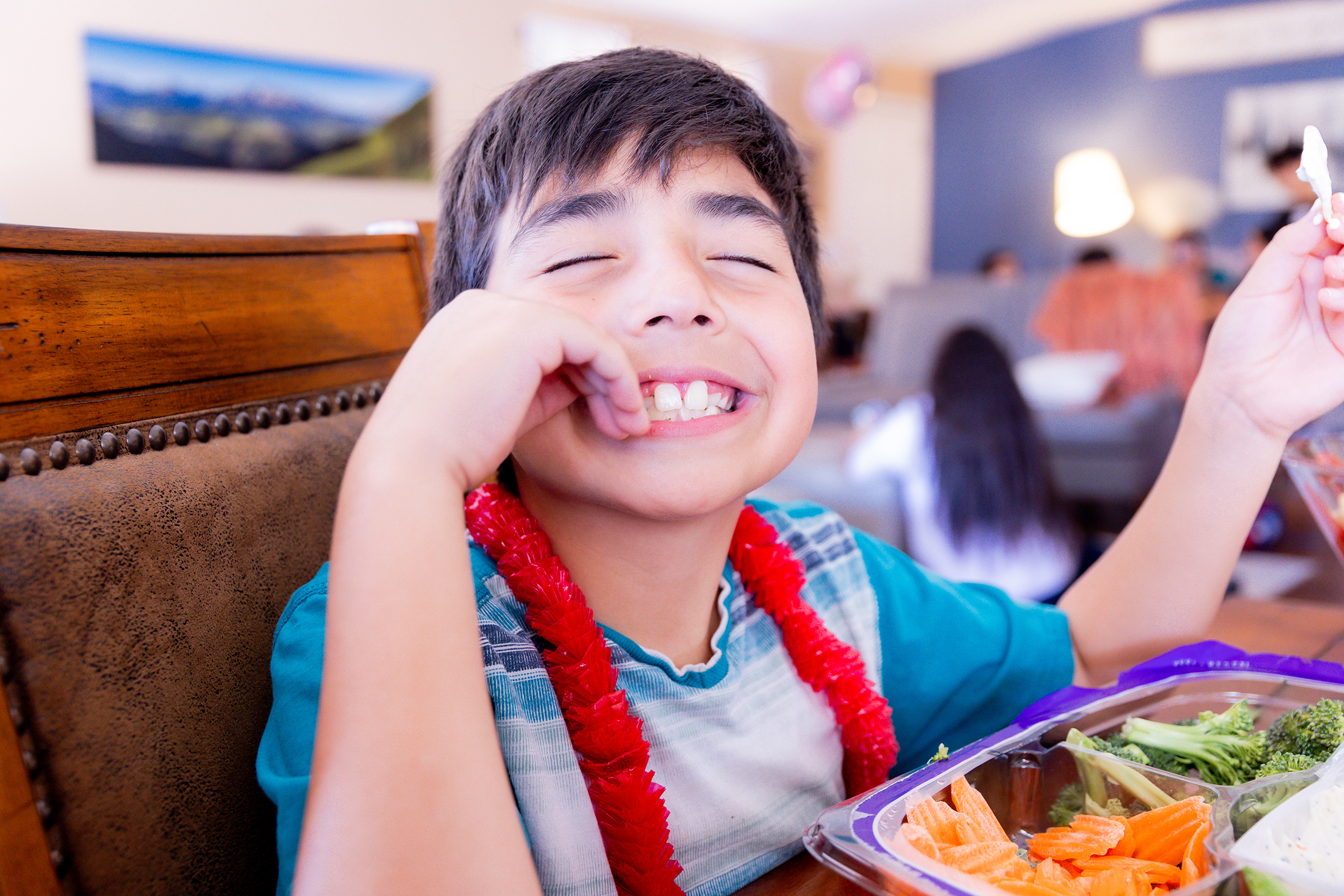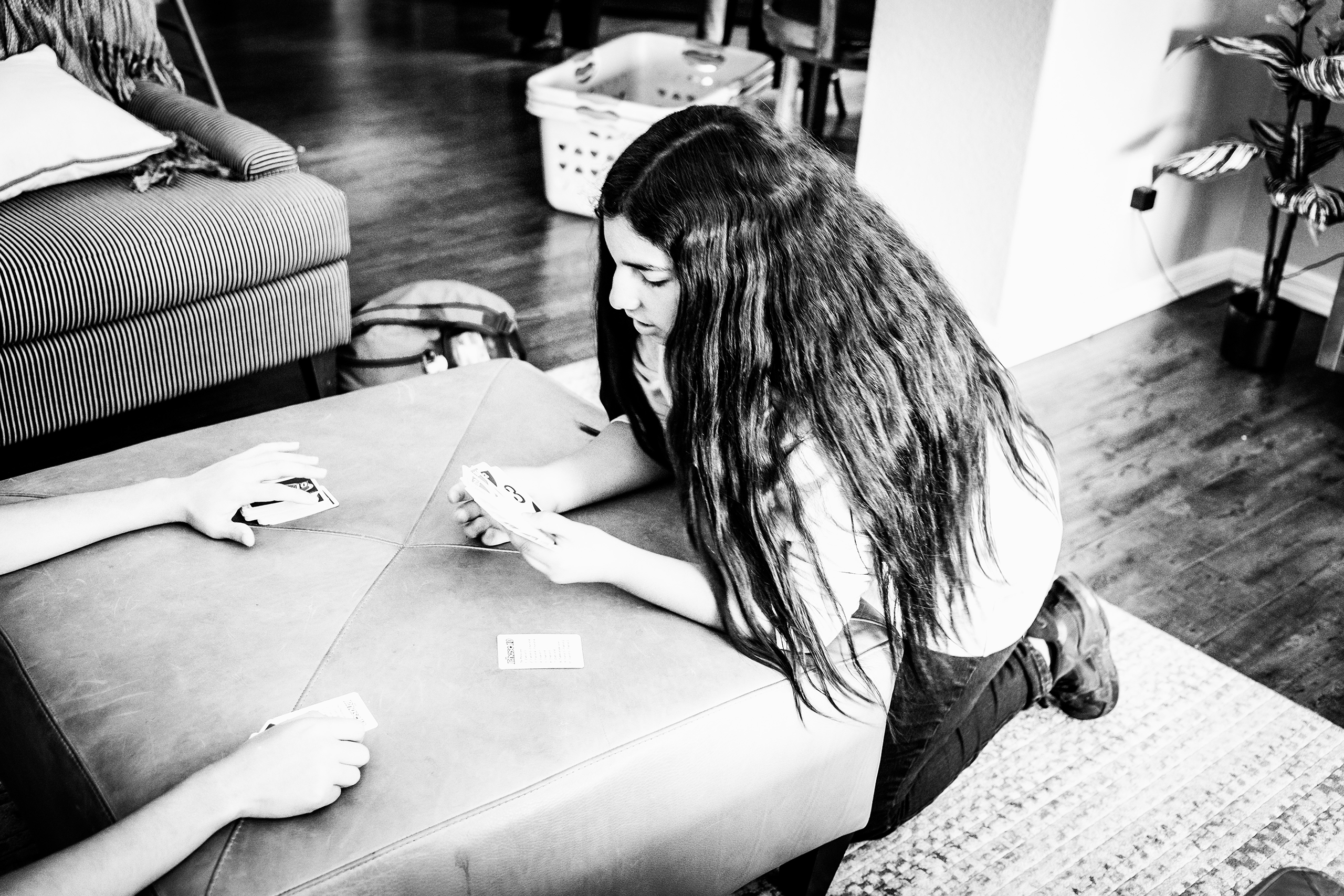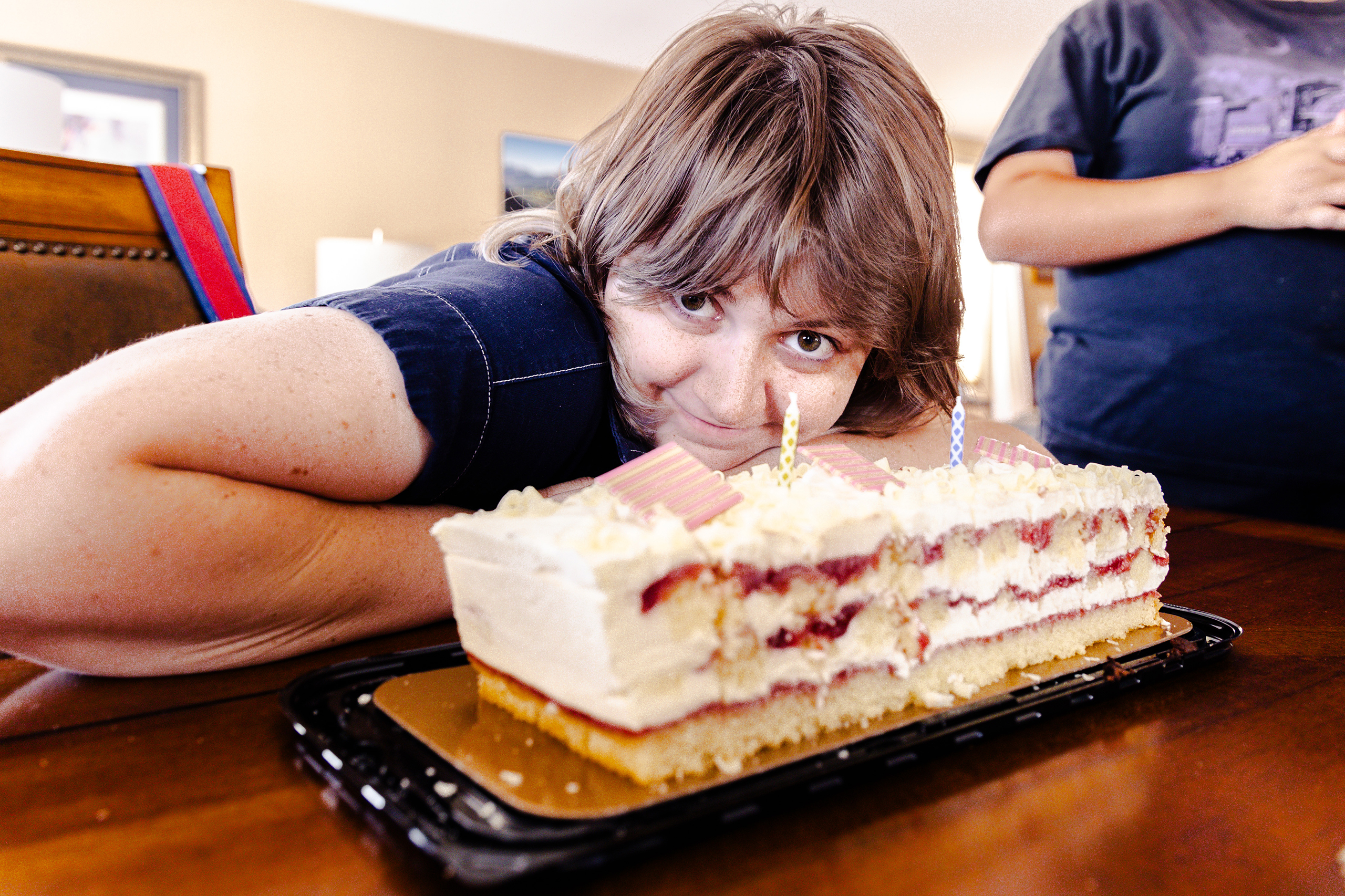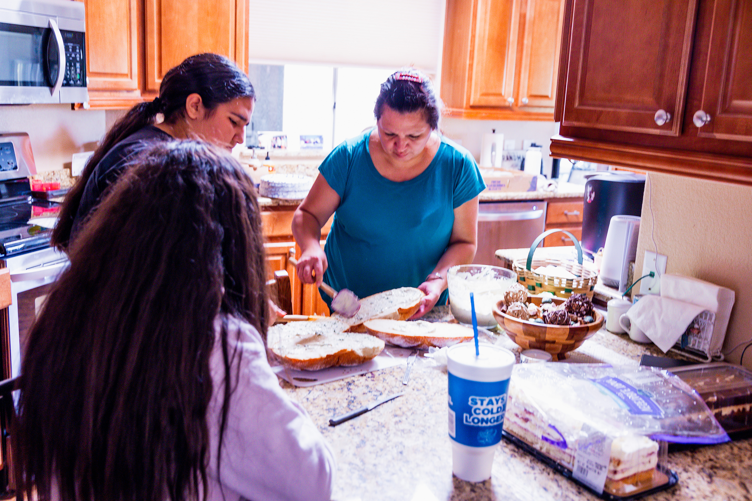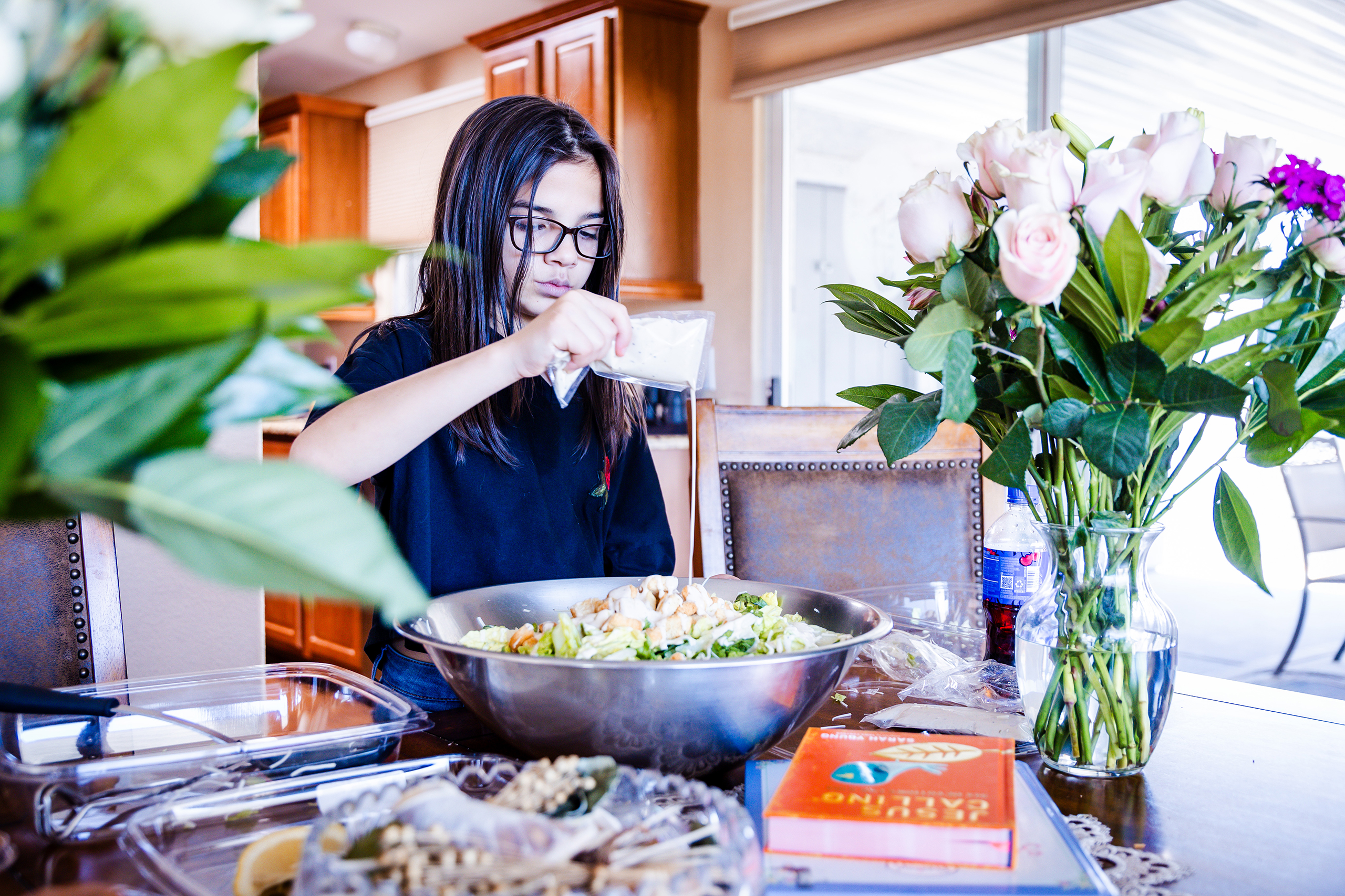 On this particular day, I took it upon myself to bring dinner down to Grandma’s place. Most often when we trek over there on a Sunday to pick up kids that have been there for the weekend, we just order up some Little Caesars, or Grandma does some cooking (especially if Natalie is there to help). But of course I wanted to take that burden off her for the day, so I started planning and scheming a menu that just kept growing and becoming more elaborate (and honestly, yes, honey, I did buy too much food). BUT it was so much fun to put it all together, so I’m not sorry. We had veggies, dips, and shrimp cocktail for hors d’ouvres; a huge Caesar Salad that Ellie made while the main course was baking; a fruit salad, and an Italian tortellini salad; garlic bread that was SATURATED with the best garlic butter mixed by the skillful hands of Natalie and lavishly spread by Ana and Natalie; Chicken Penne Alfredo for the main course; strawberry lemonade punch for beverage; and since Efrain specifically/non-specifically requested “Not Vanilla” cake, there were both a Tuxedo Chocolate Mousse Cake and a Strawberries and Cream Bar Cake.