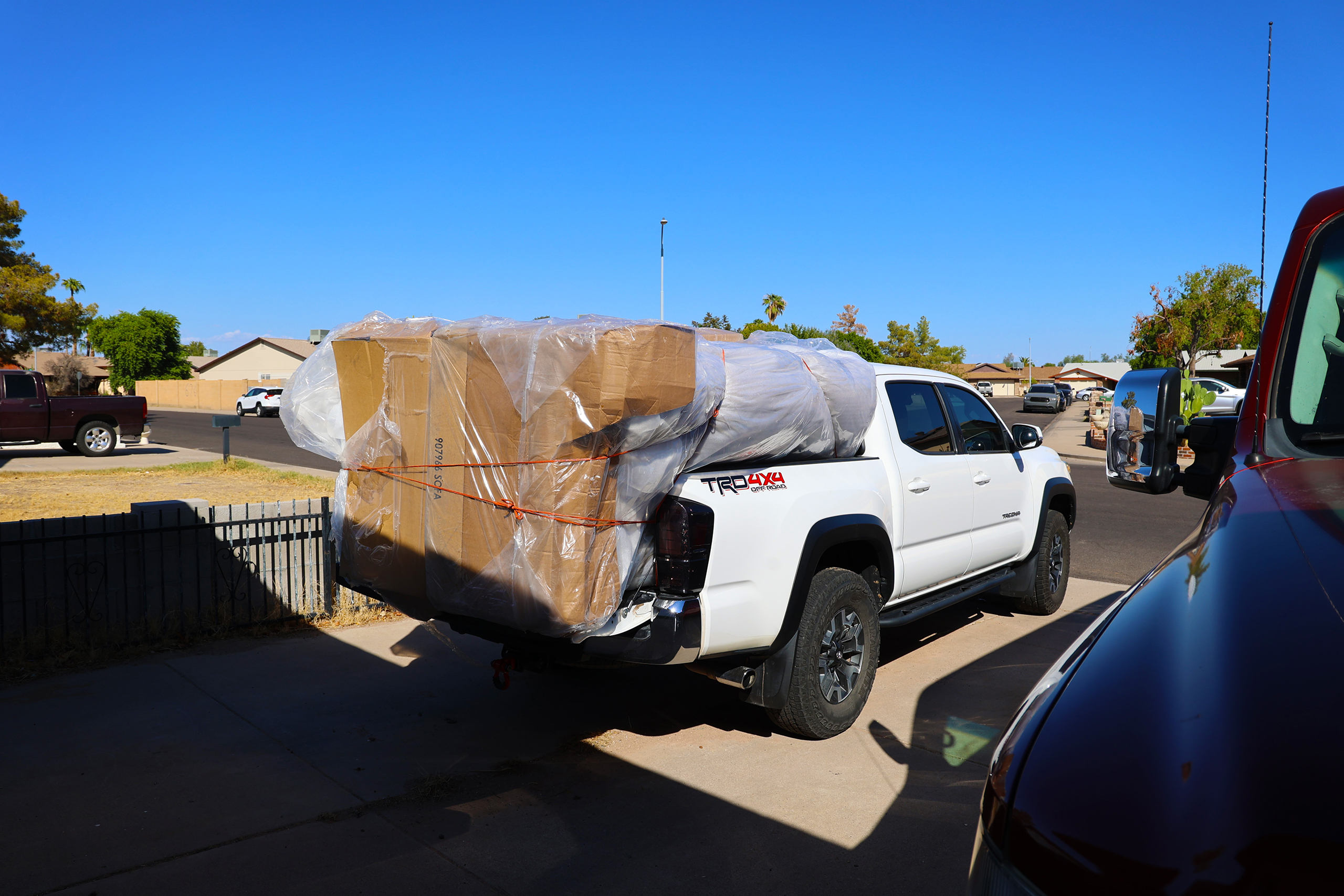 Enter tax refund money! Despite a long list of possible home repair uses for the windfall, I have been wanting to do this for at least two years, and finally decided it couldn’t wait any longer. So off Paul went to American Furniture Warehouse with Jacob and Tom Truck, and home they came, loaded to the max!