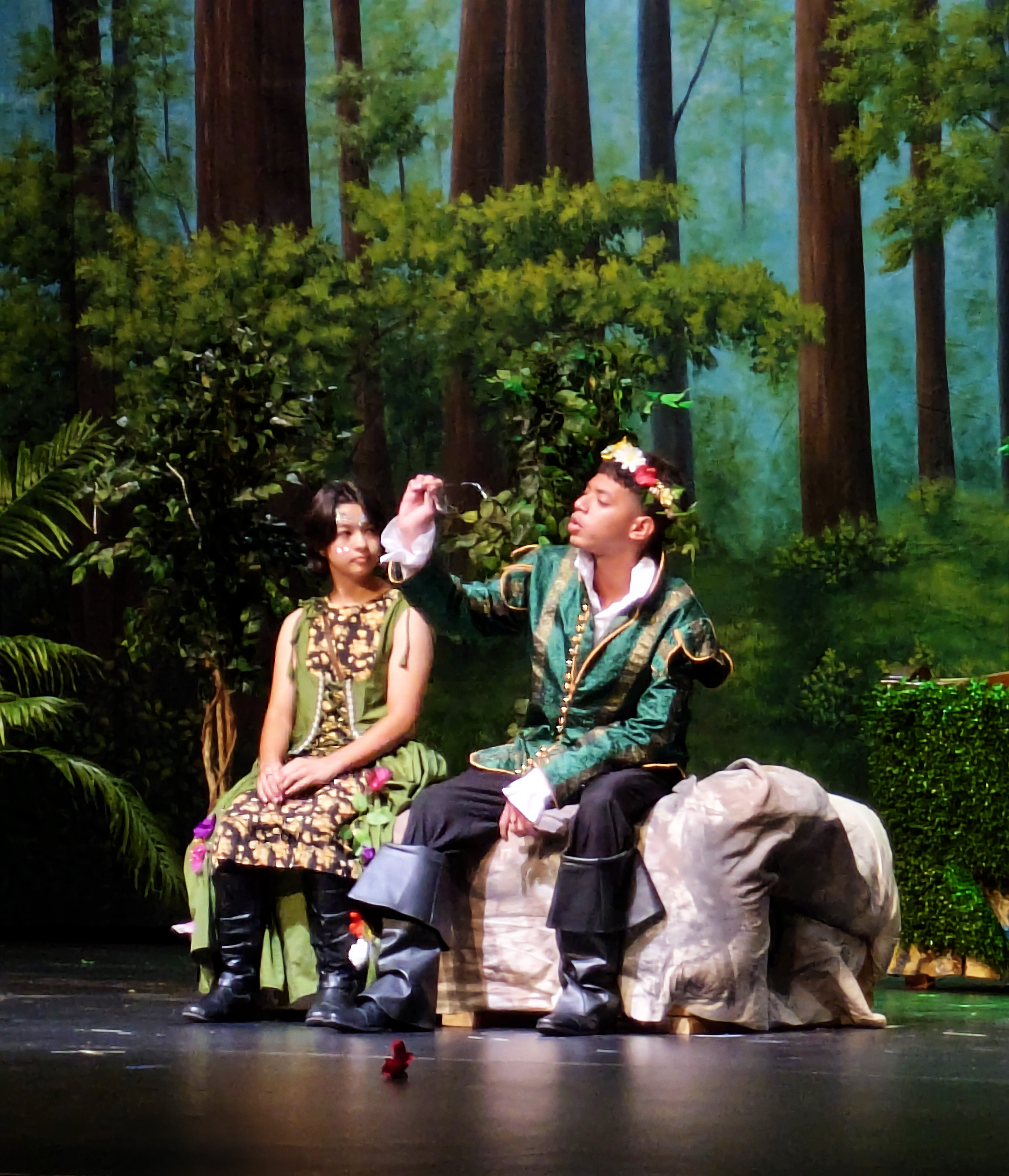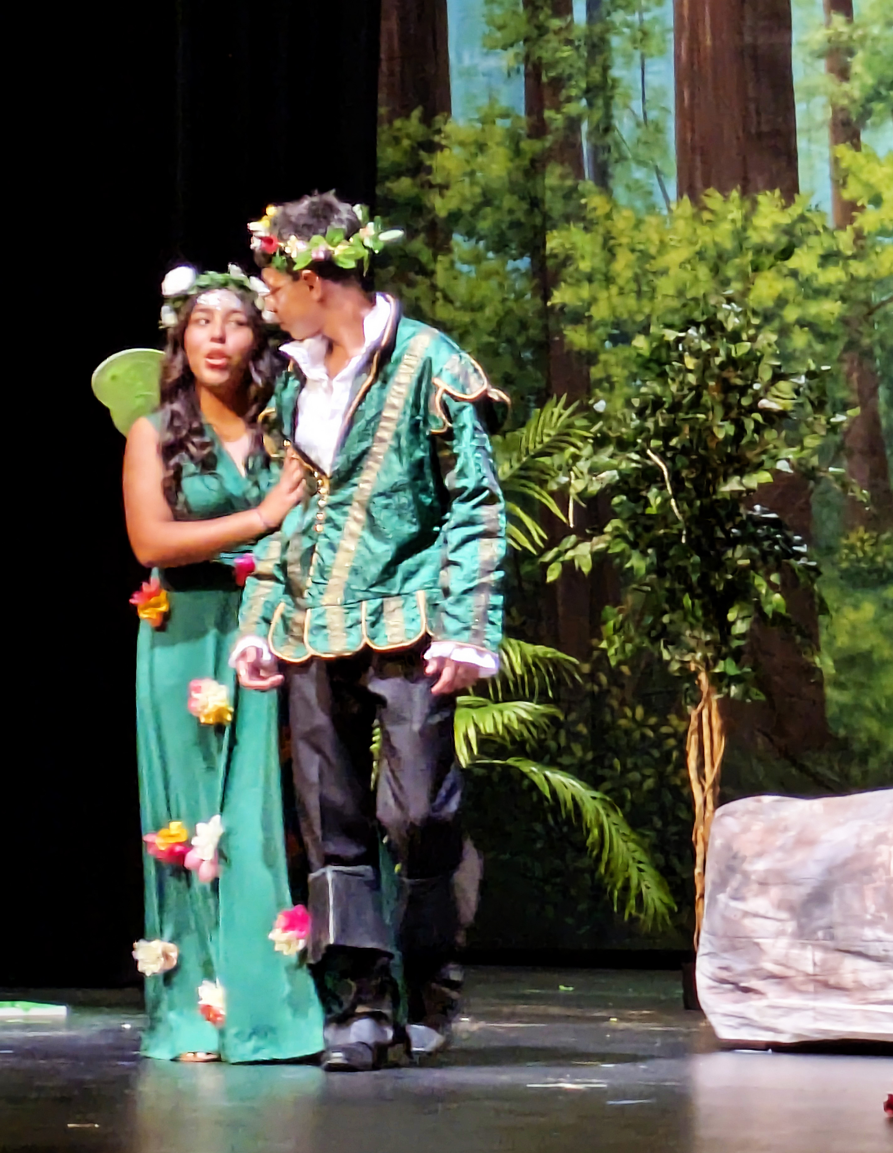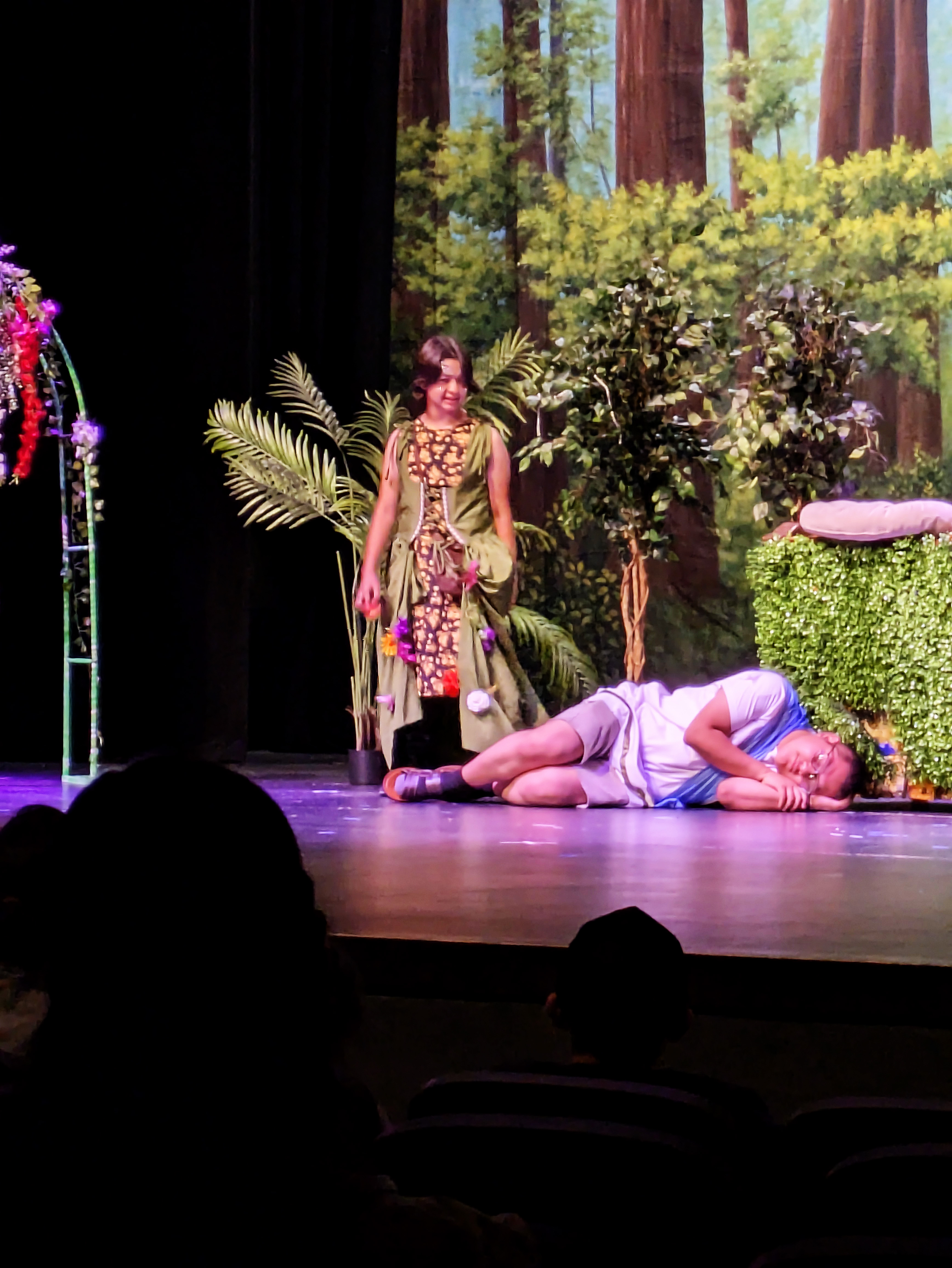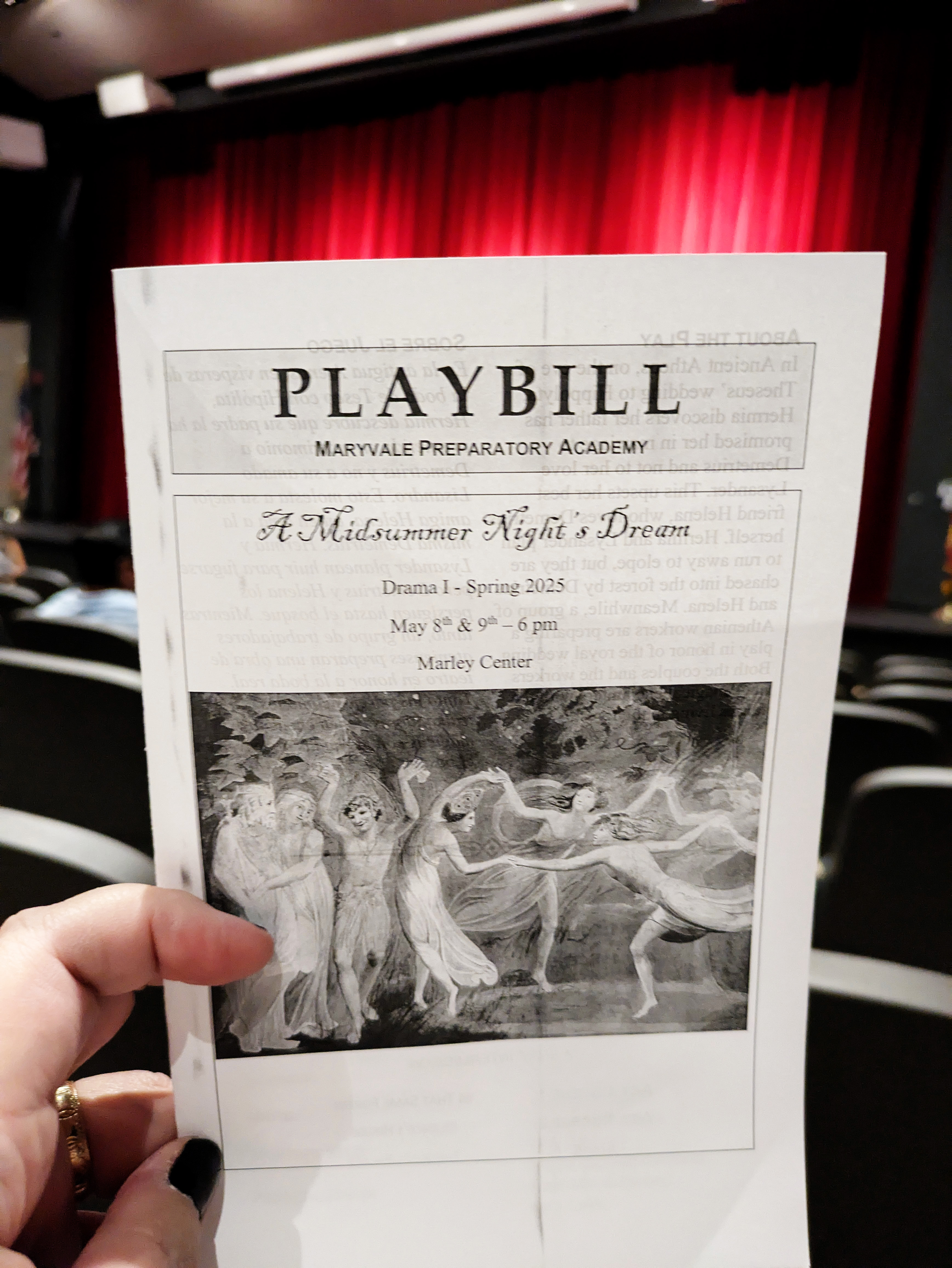 Friday night, Ellie and I had the privilege of attending the final performance of the Maryvale 11th grade drama production of Midsummer Night’s Dream. It was notable not only because Natalie was playing the part of Philostrate (as well as Stage Manager for the other performance), but also because it was the first time I have been able to walk into the Marley Center on my own two feet and sit through a performance of any kind in a regular chair rather than my wheelchair.