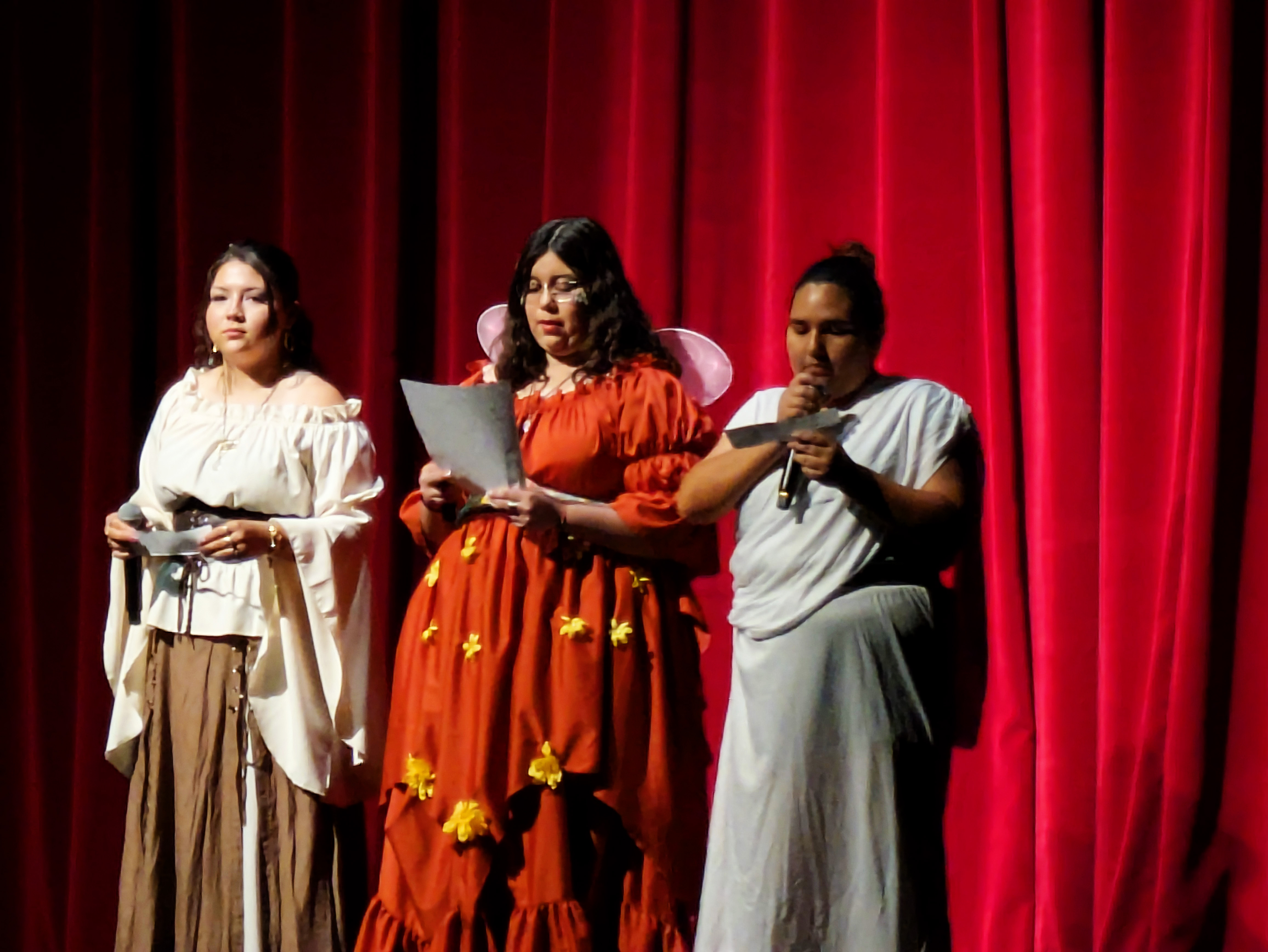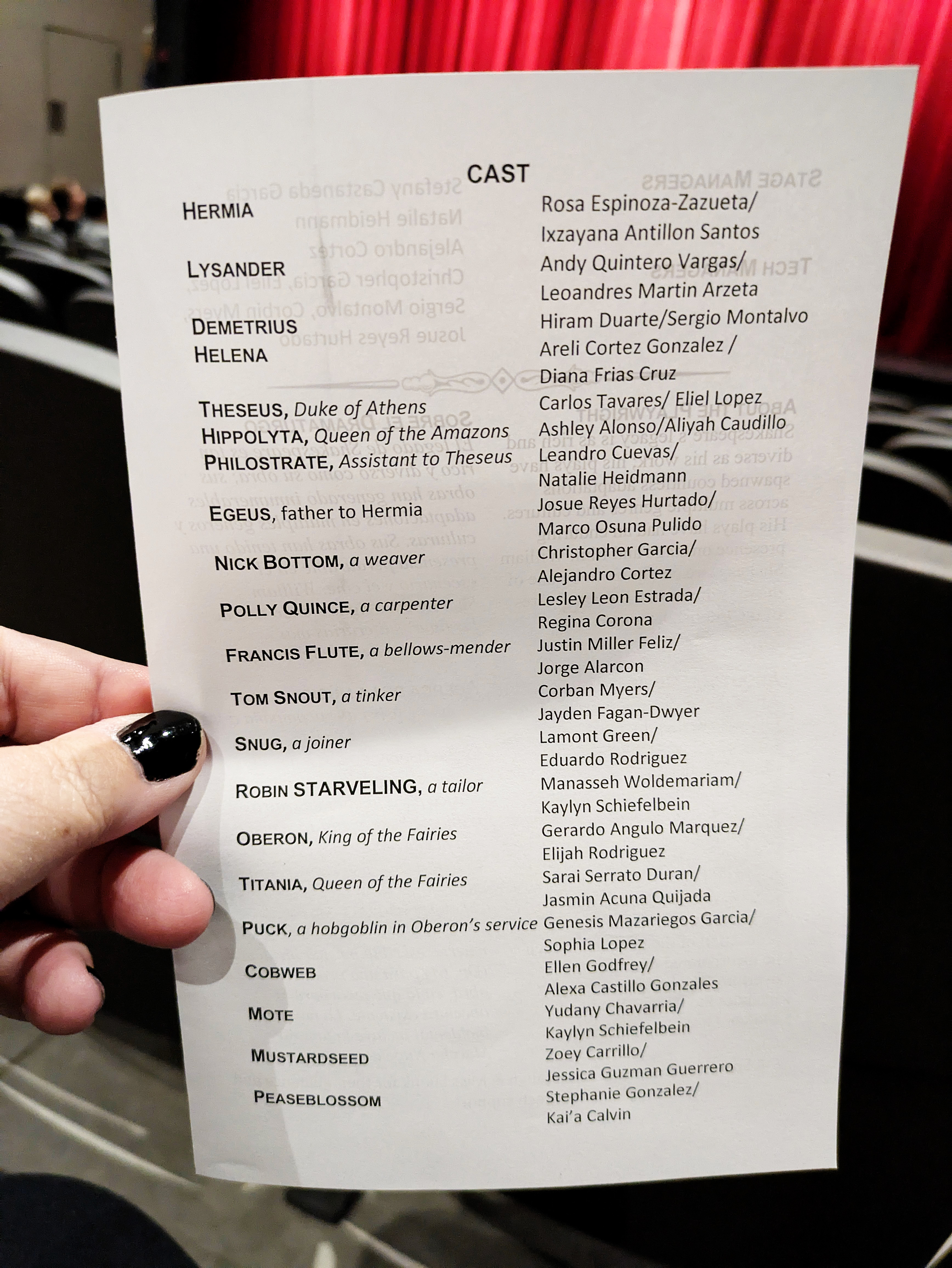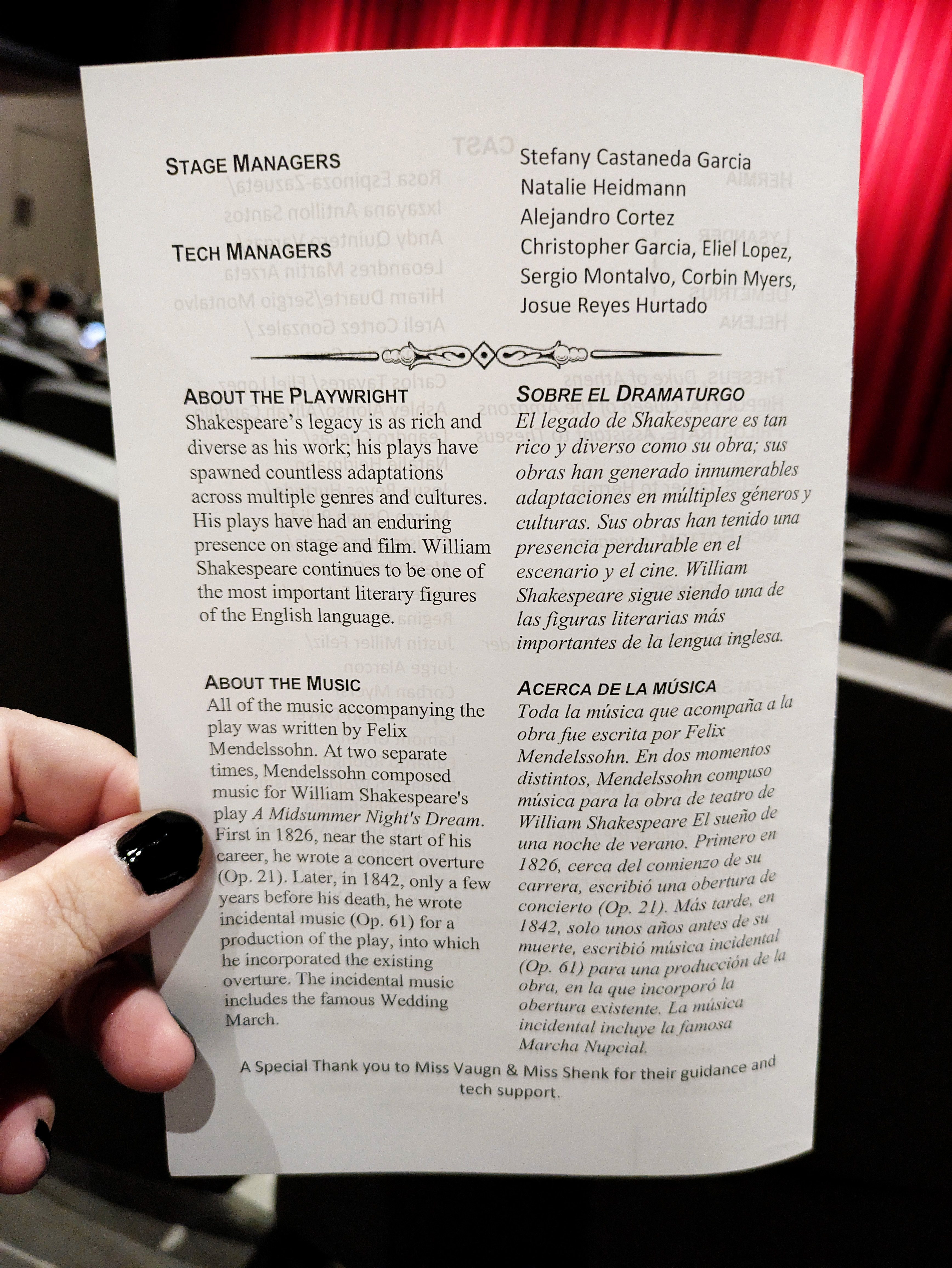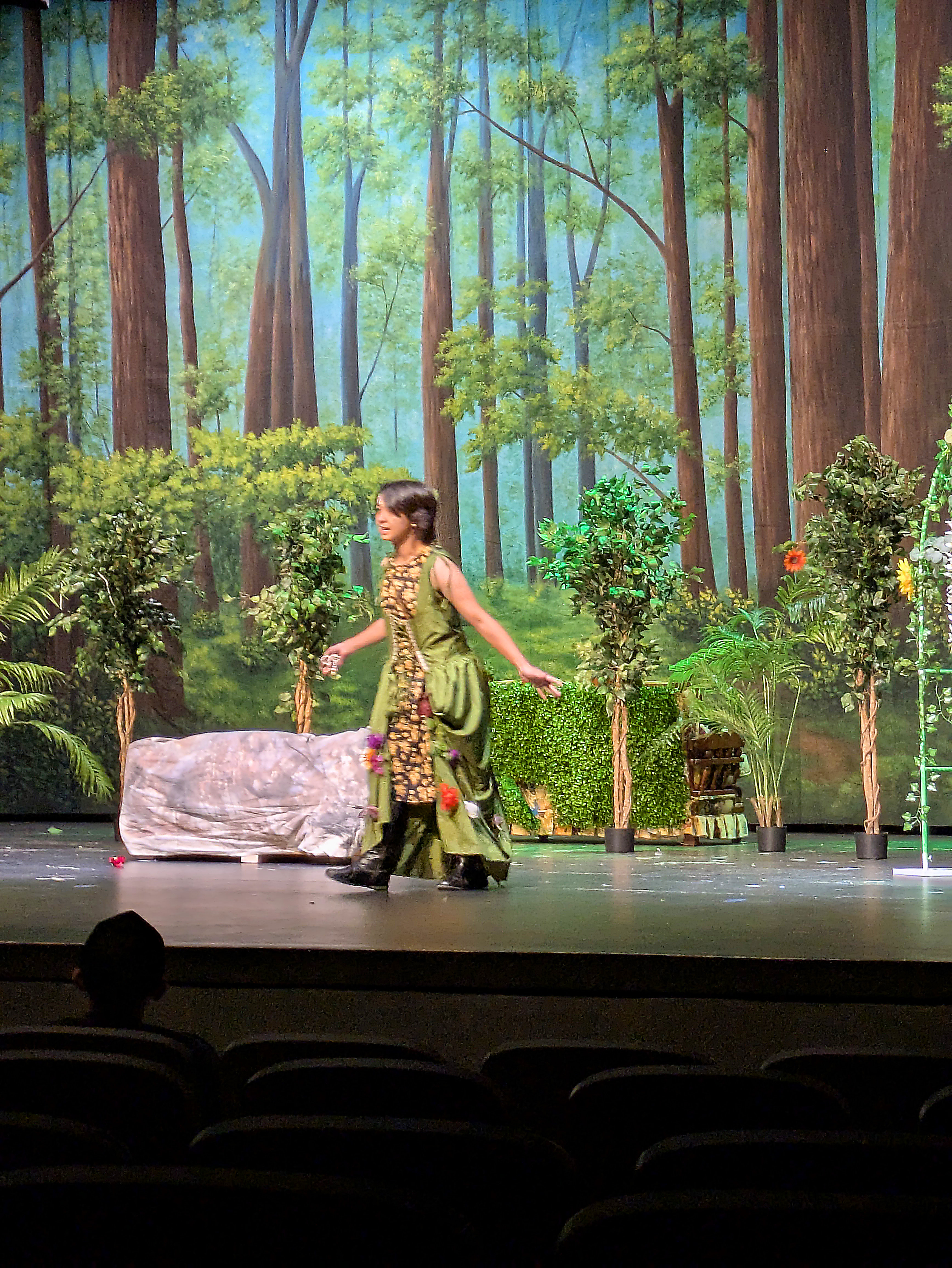 I found the whole evening extremely entertaining, as a former thespian myself. I thought the kids did a fantastic job, particularly since these are not the “theater kids” who go out for drama because it’s their thing – everybody in the class had a part in one of the two performances, and on their off night they were stage hands for the other cast. They could have totally phoned it in, but they swung for the bleachers and it was awesome. There were so many great moments, and my hat is off to the whole cast, stage crew, and their terrific director, Mrs. Rand-Lowe. Fabulous job, everyone!!