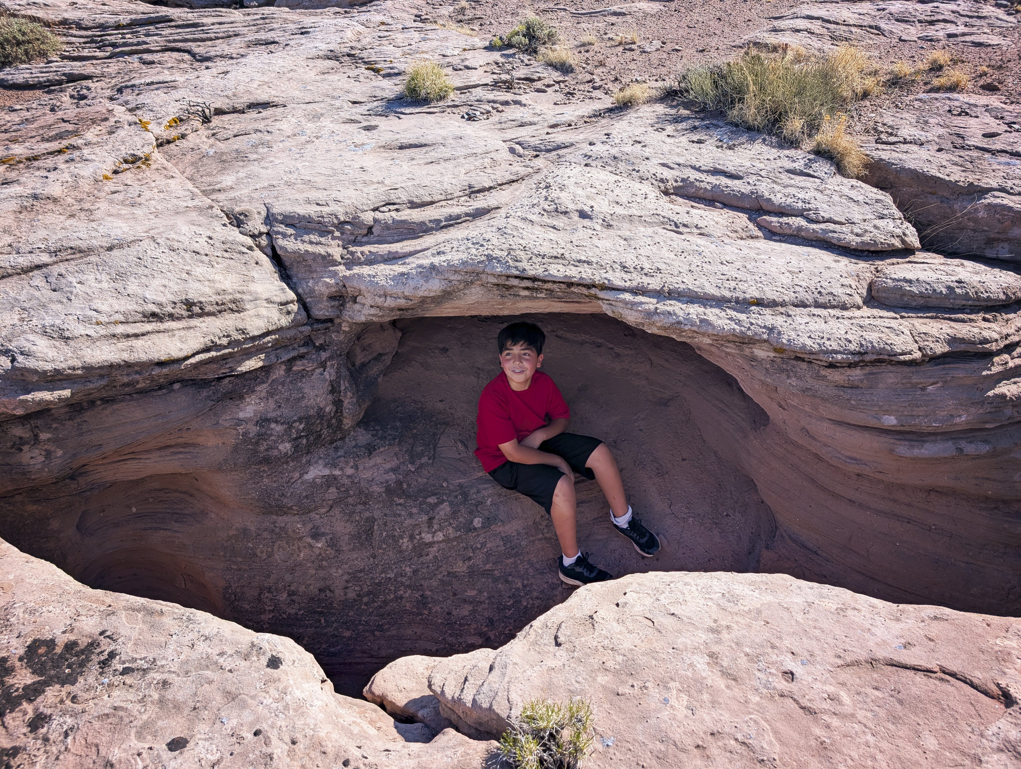 I keep bringing the kids back here, never remembering that this is a bad idea. The entire hillside is bentonite clay (decomposed volcanic ash), which is very crumbly and slick. This makes many of the rocks unstable (because they rest on the bentonite). Further, most of the rocks are either sandstone or mudstone, which means they are prone to cleaving (breaking up). So, we end up climbing this slick steep hill, grabbing onto rocks that either slide away or break up. The hill is bigger than it looks in that first picture too. In a few of the pictures, if you look closely down in the valley below, you’ll see the little white dot that is my Tacoma. That should give you an idea. We sure had fun, though. We made it up and down, with no injuries!