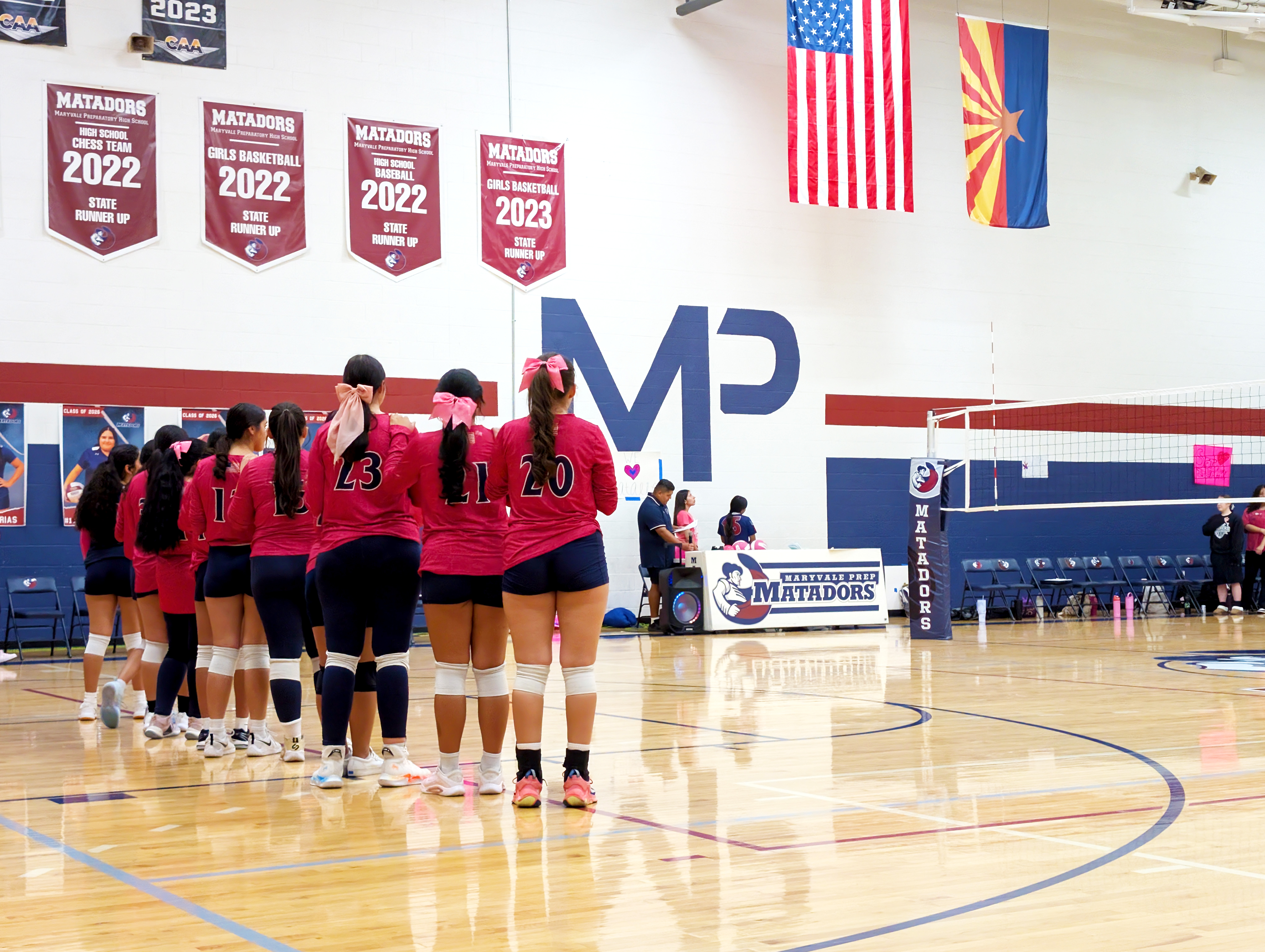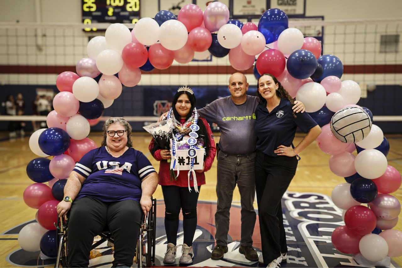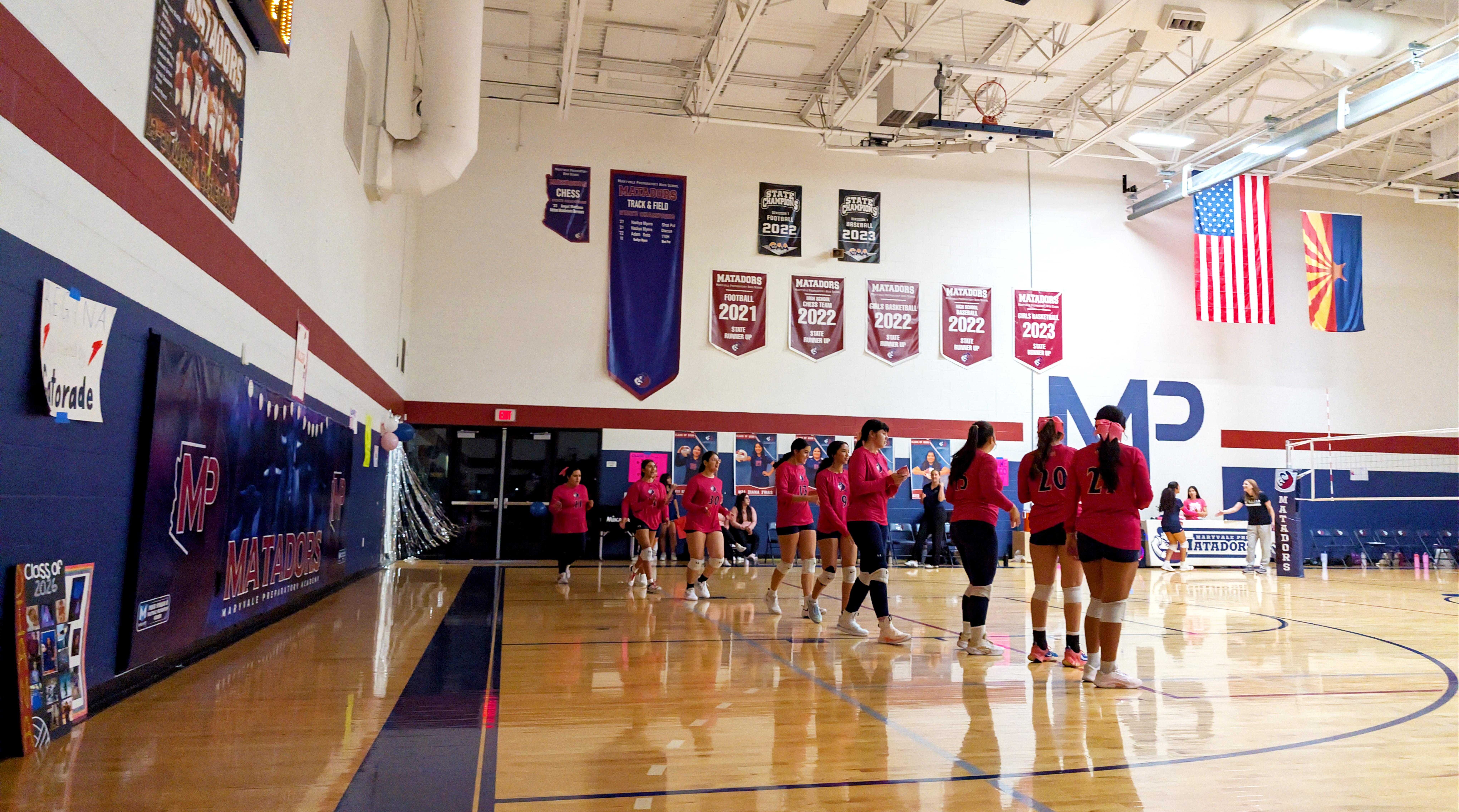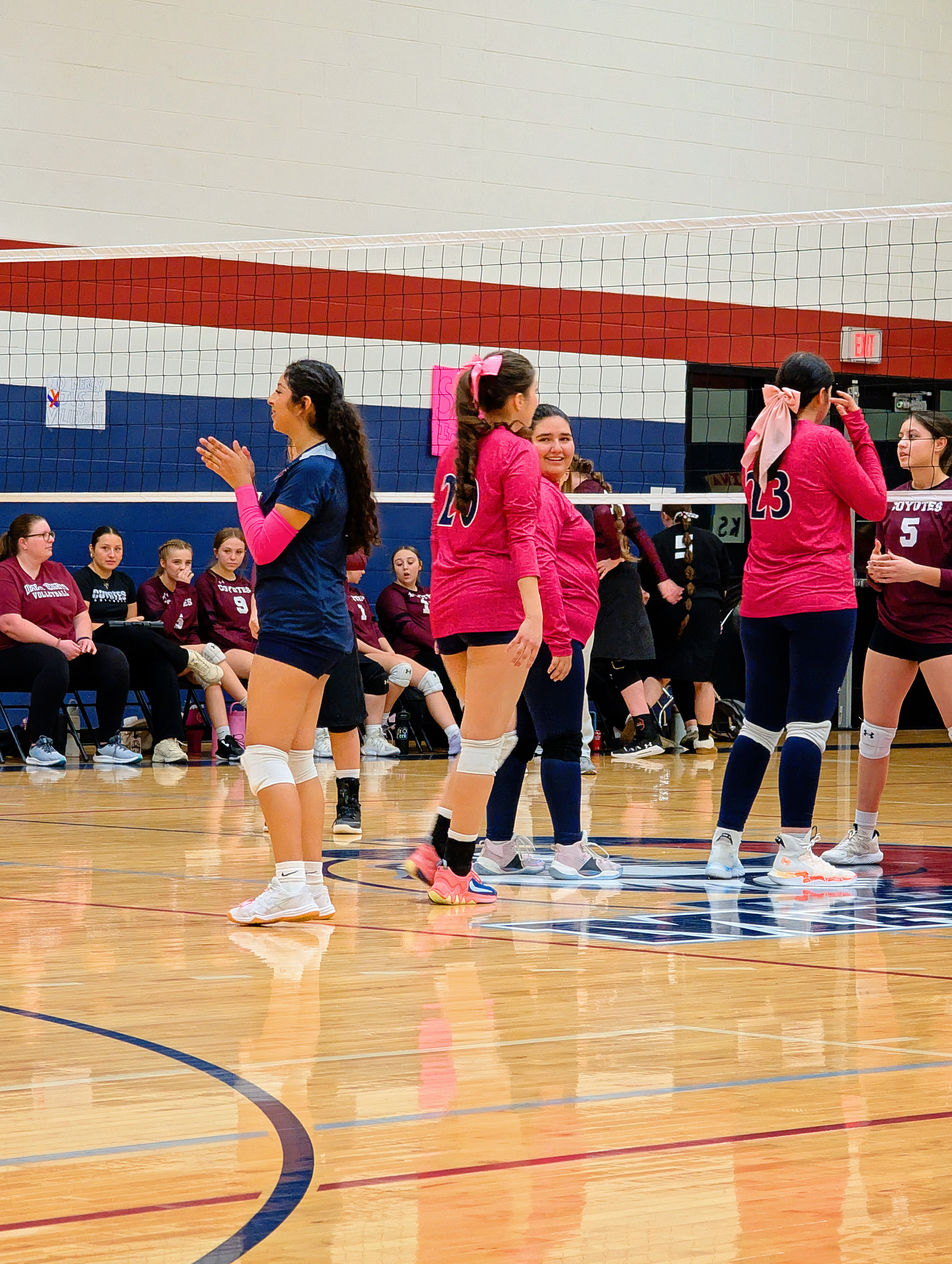 Here are my sad attempts at photos from the evening, all from my phone except the first which was taken by one of the staff before the game – each senior got to walk a red carpet up the middle of the gym with their parents and pose by the balloons. The gifts Natalie is carrying include a basket of treats, necklaces made of candy wrapped in cellophane, flowers, sash and tiara – they really go all out!
