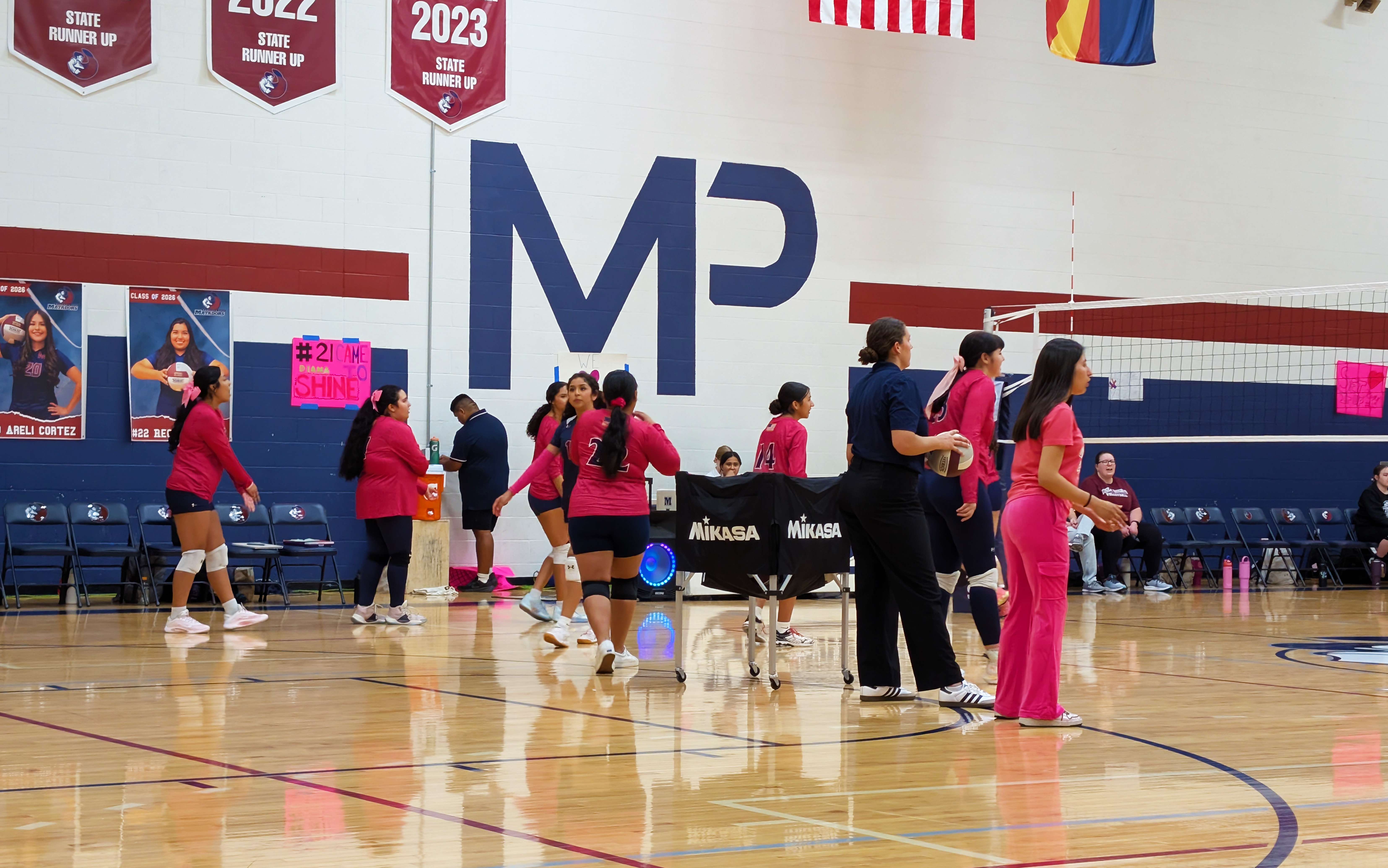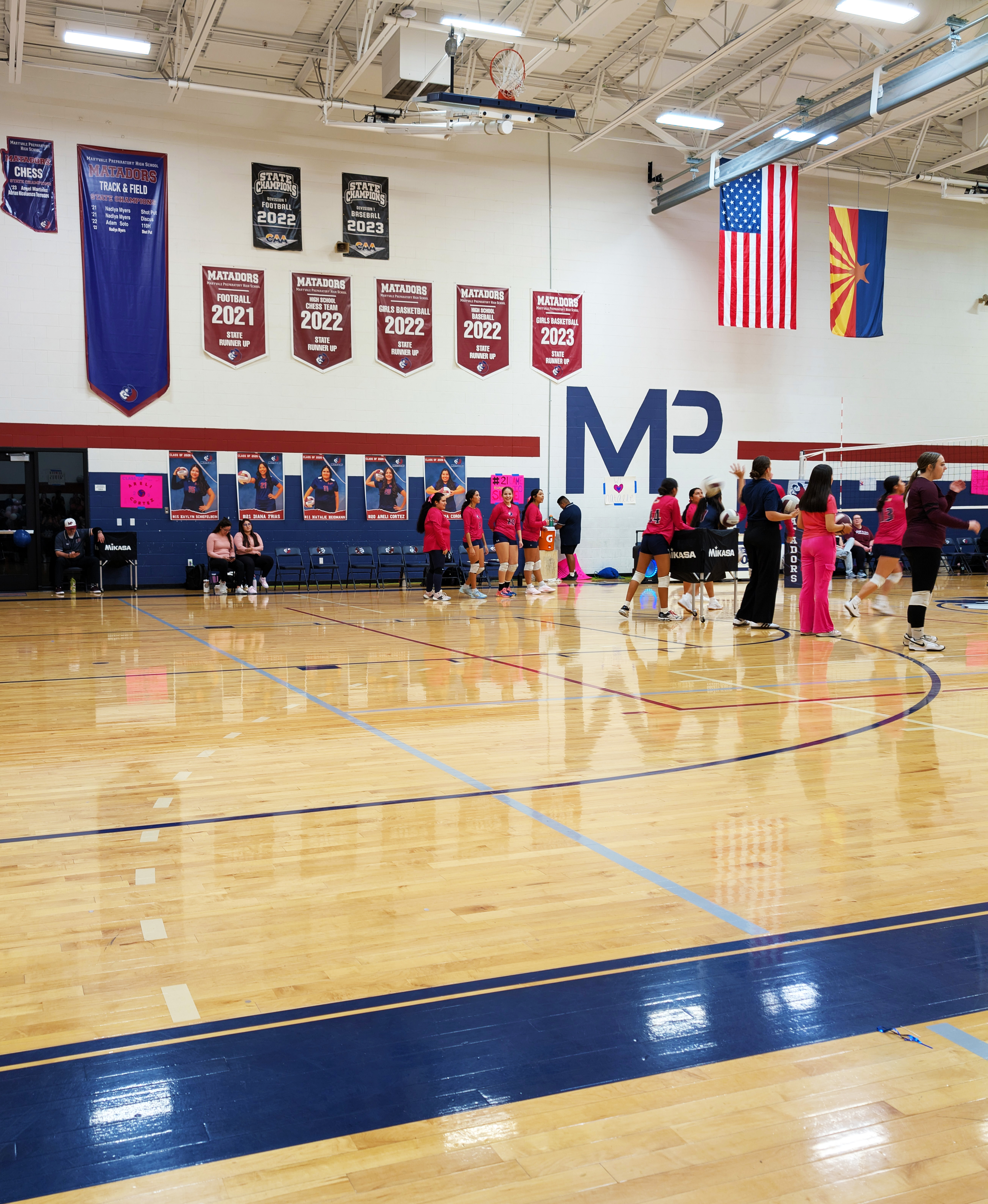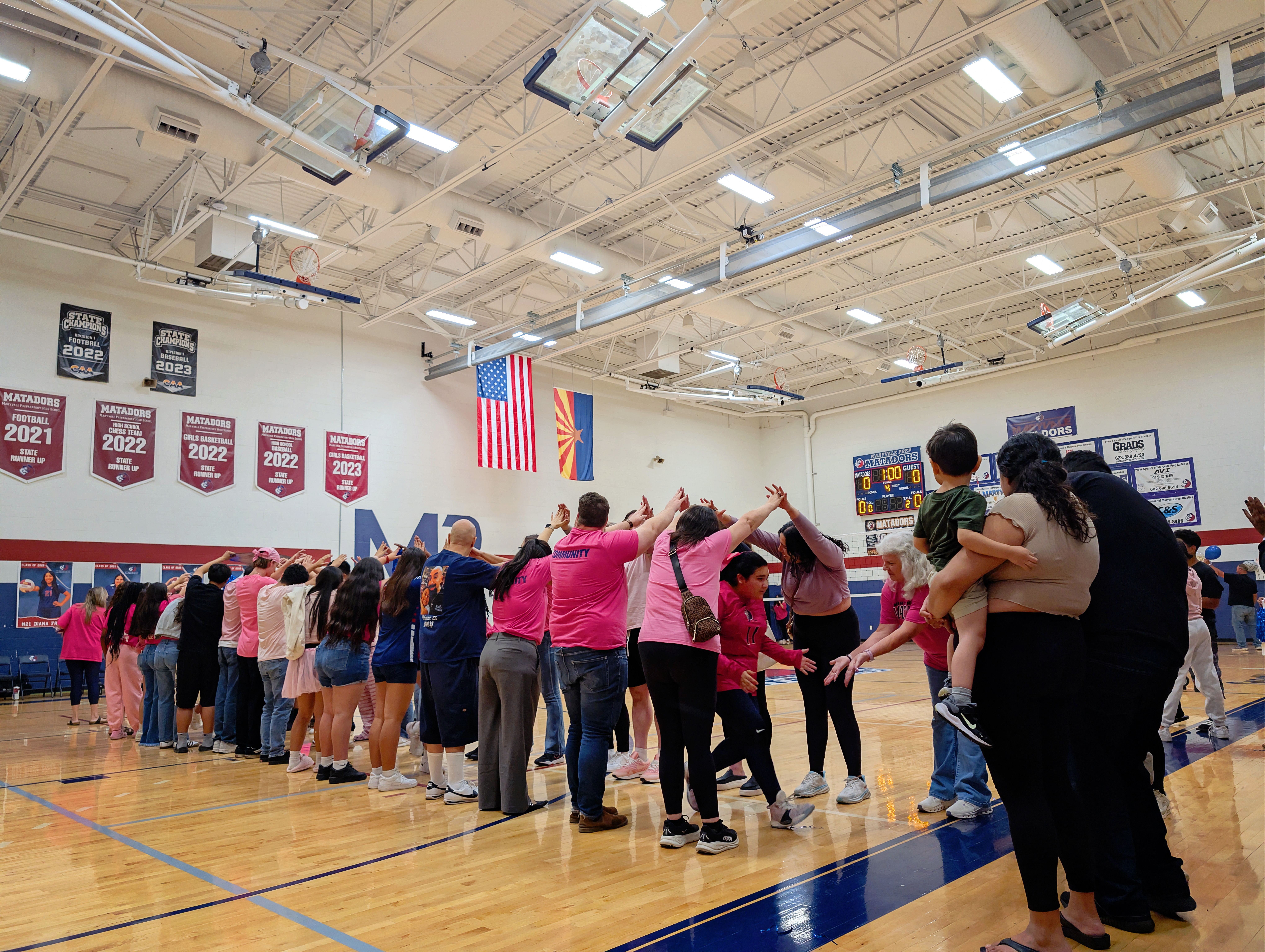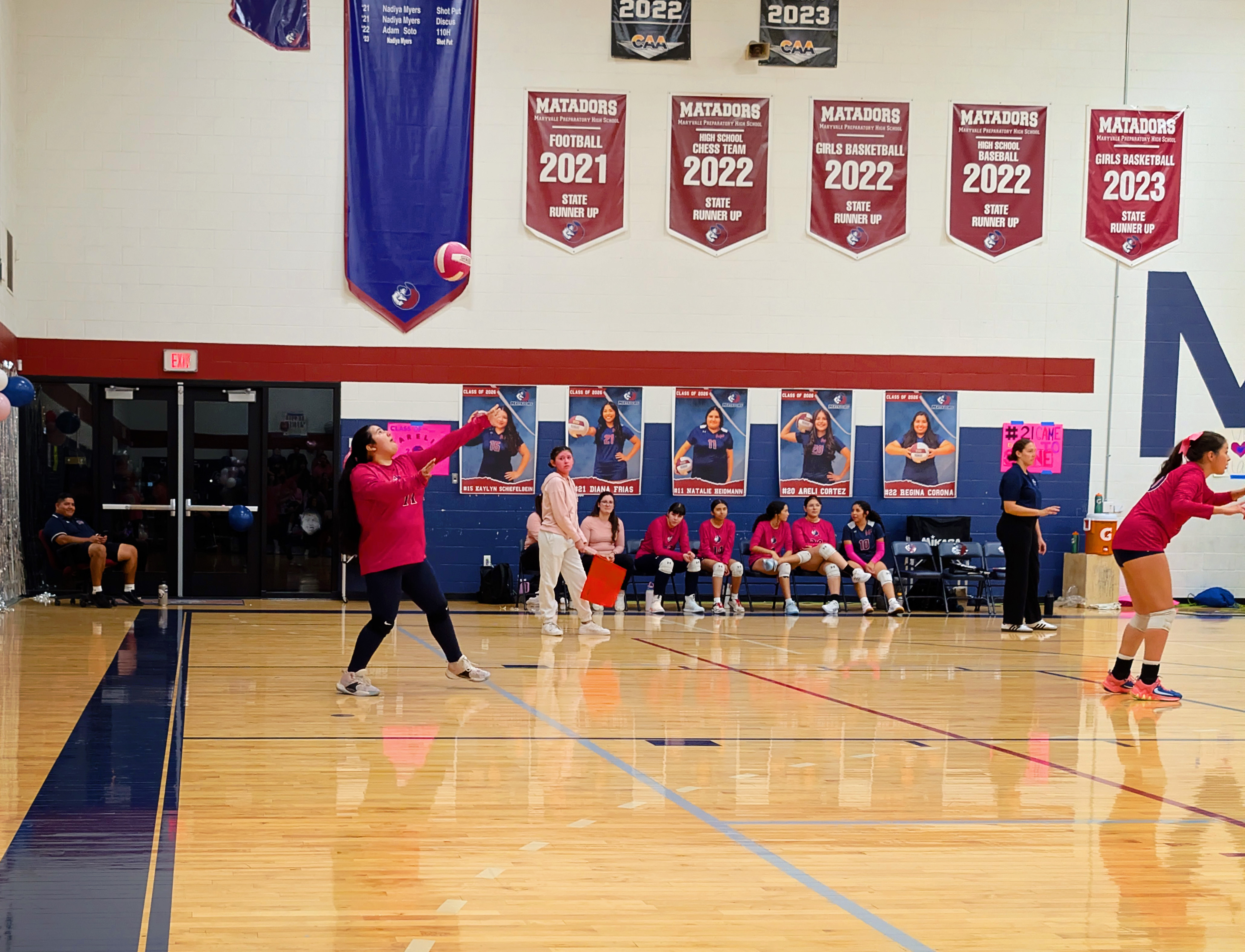 Here are my sad attempts at photos from the evening, all from my phone except the first which was taken by one of the staff before the game – each senior got to walk a red carpet up the middle of the gym with their parents and pose by the balloons. The gifts Natalie is carrying include a basket of treats, necklaces made of candy wrapped in cellophane, flowers, sash and tiara – they really go all out!