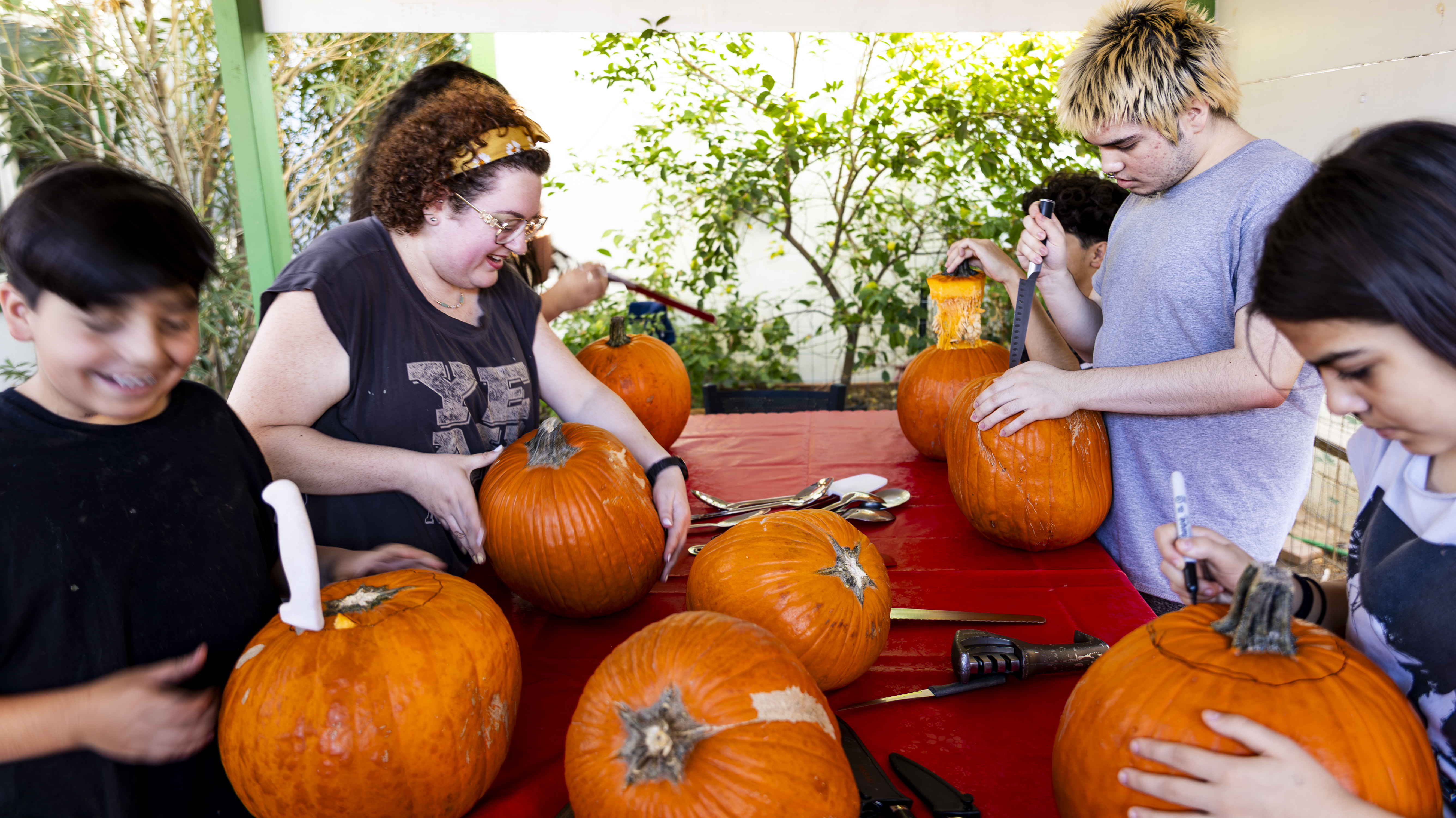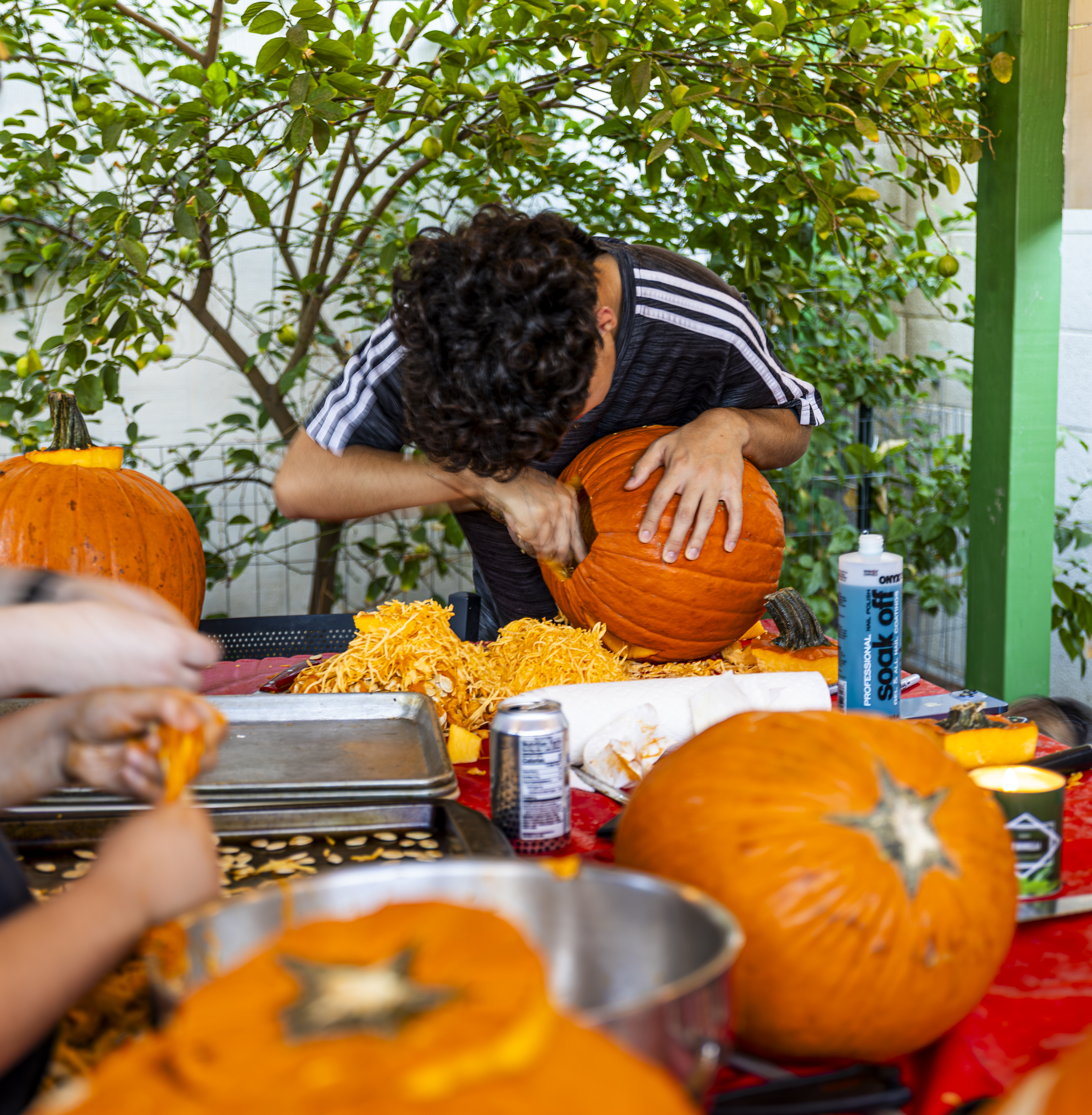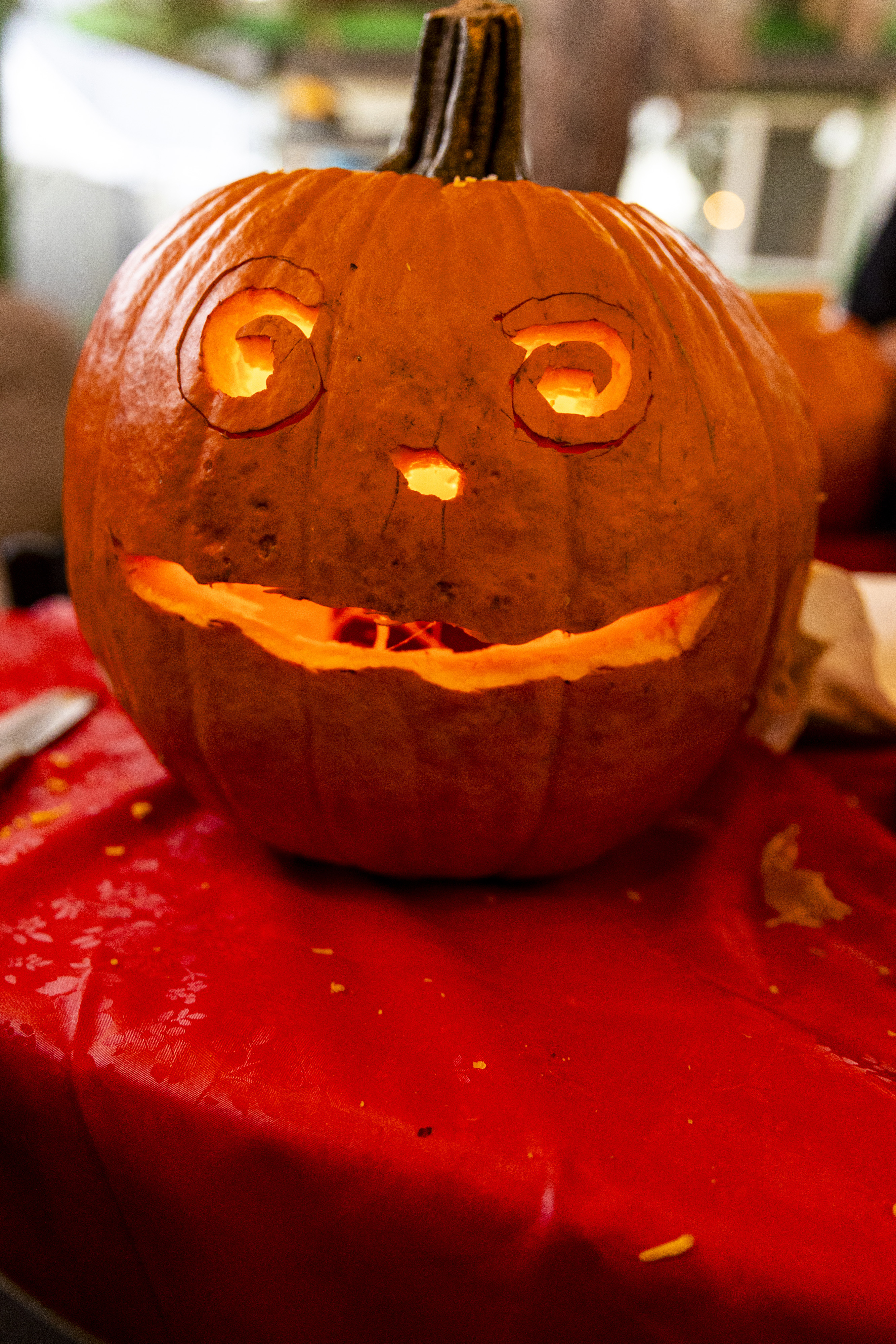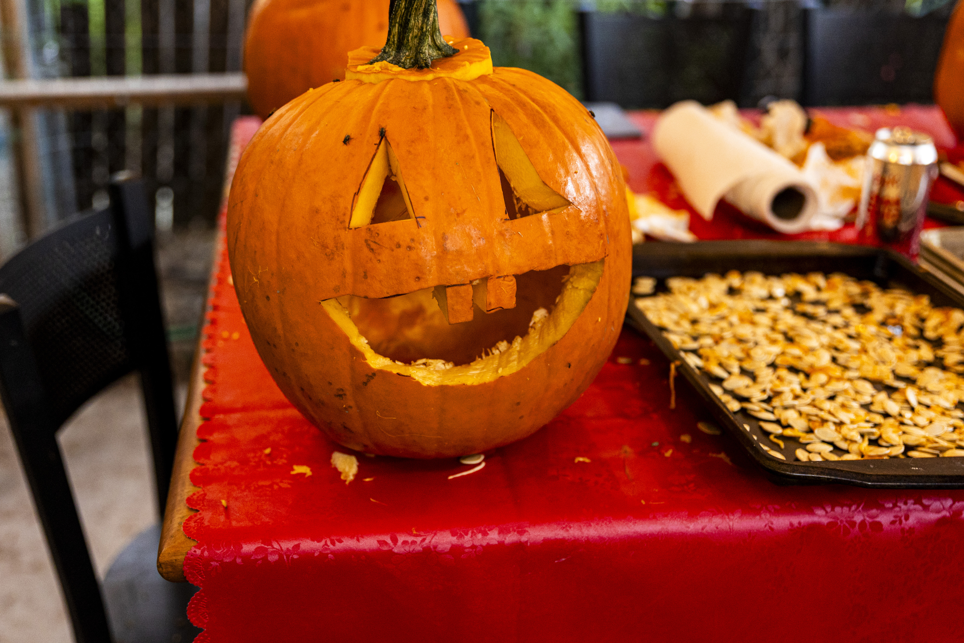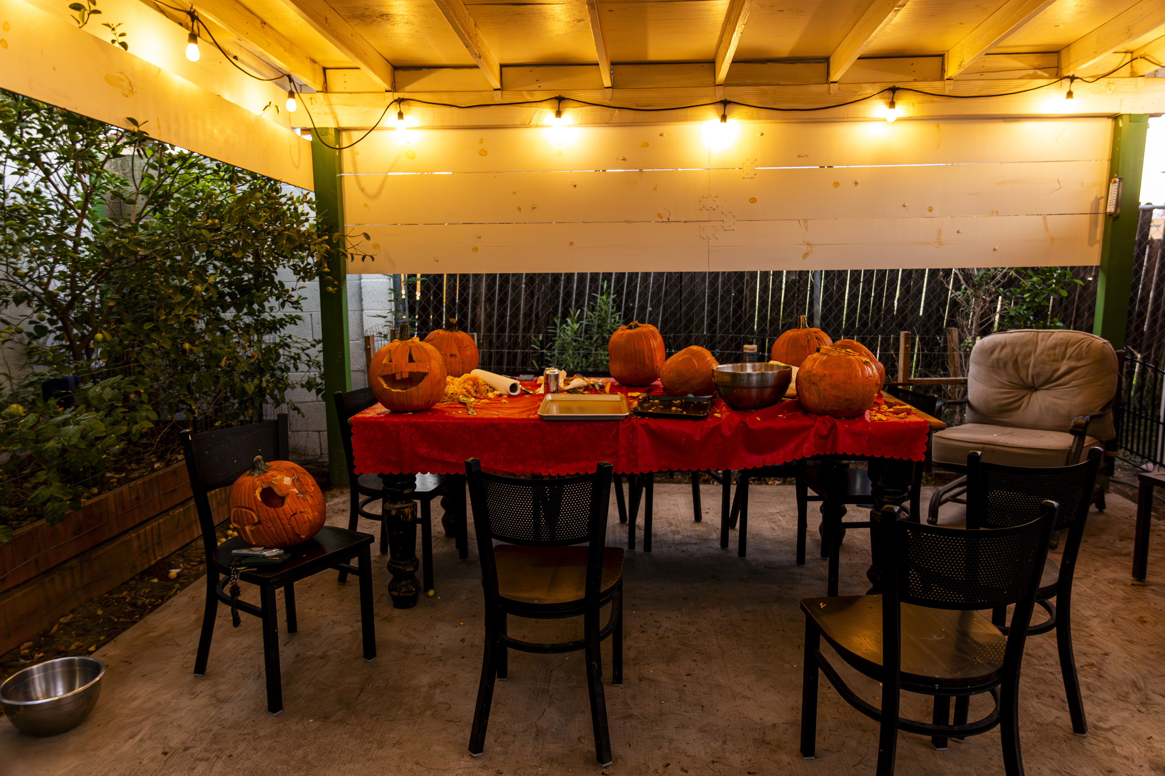 When I got up it was time to start organizing. I got a vinyl tablecloth onto the outside table and we had all the pumpkins ready by the time Laurent arrived – with more knives, thankfully! From there the fun began, and it went surprisingly easily. Even Ruben did a great job with all the carving on his own pumpkin! Paul, Jacob, Efrain, and Natalie did not participate for various reasons, and there was one pumpkin that had already gone soft on the bottom, but with Laurent joining in we ended up carving 7 of the 9 available gourds, and I think they looked terrific!