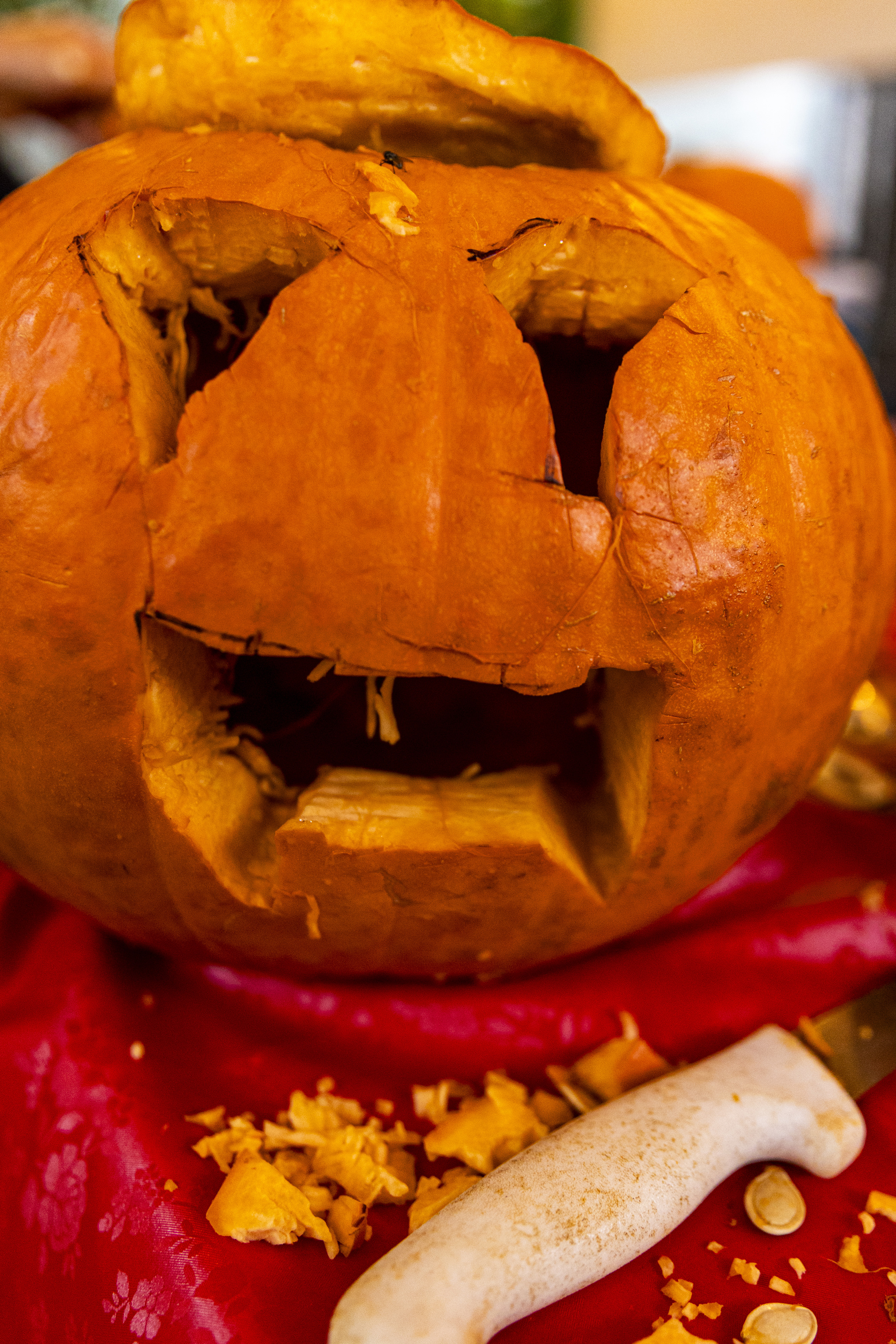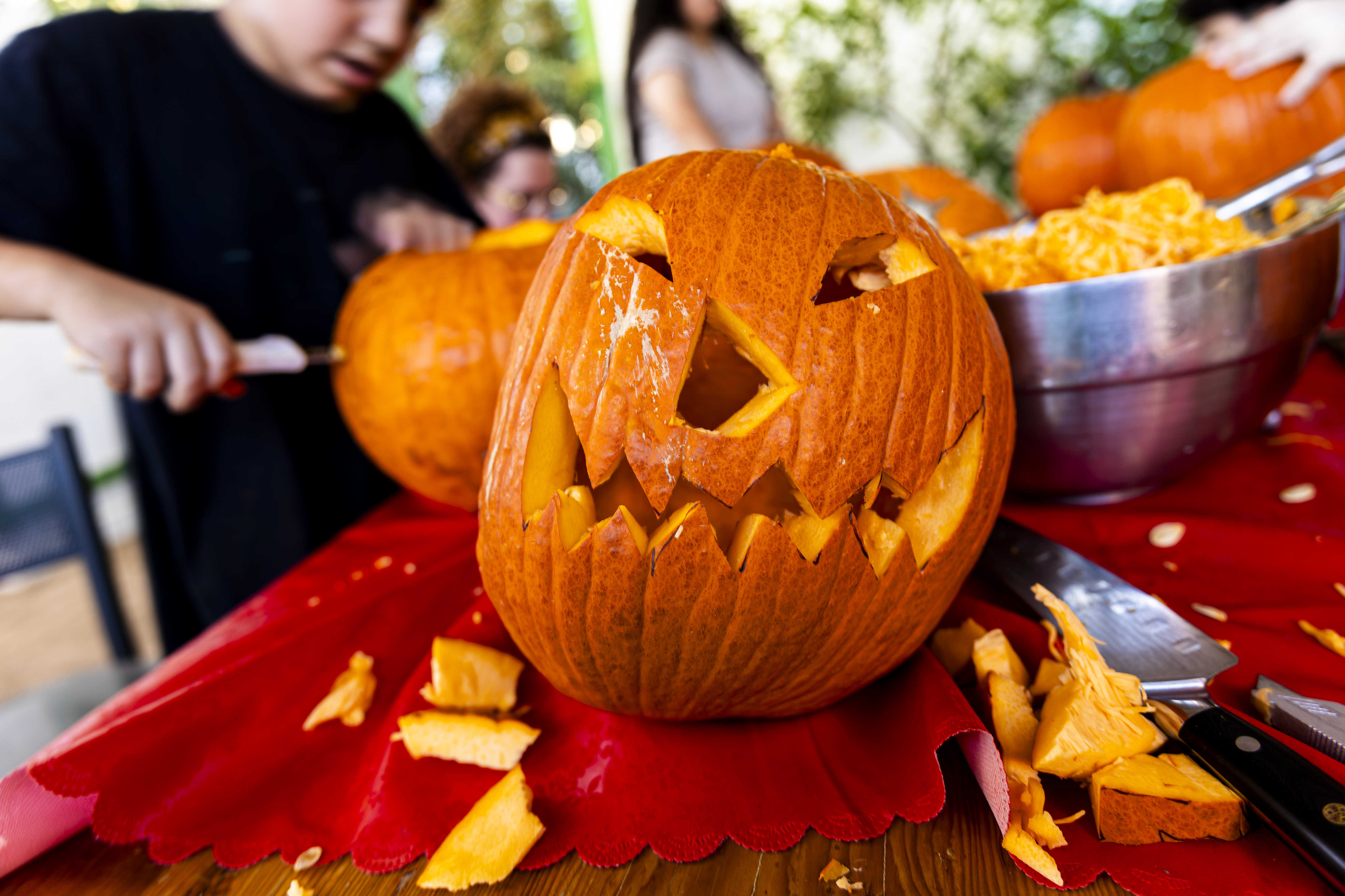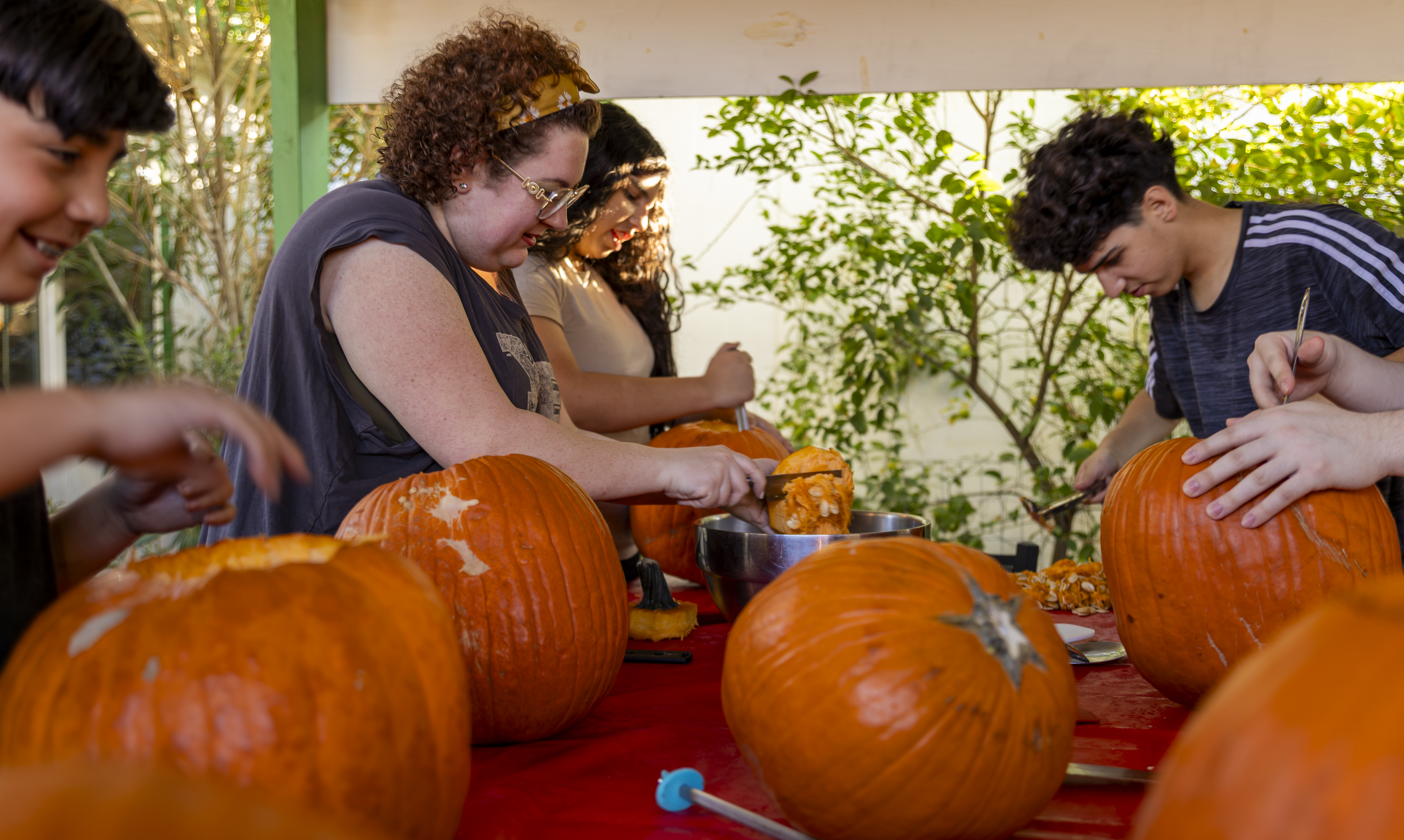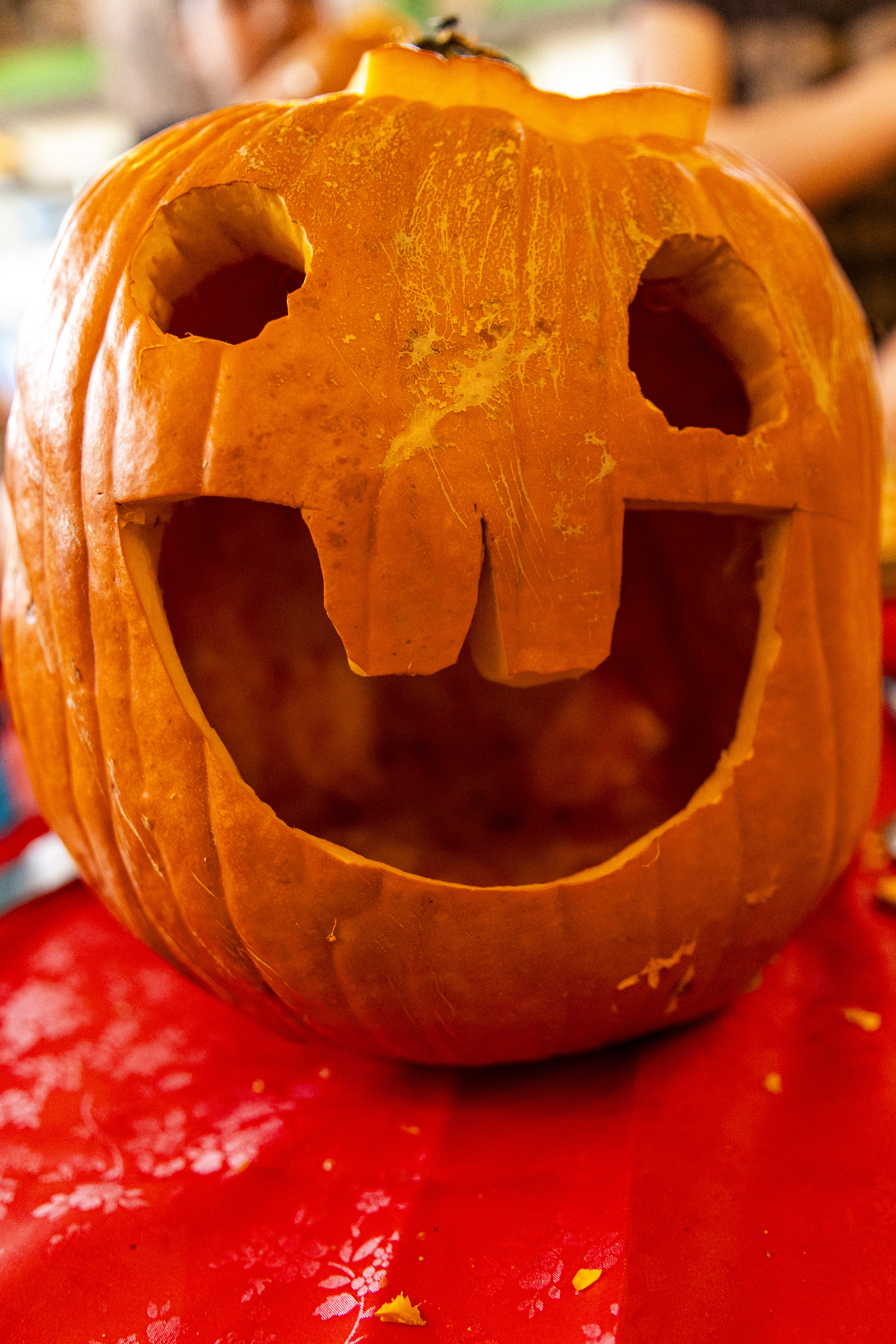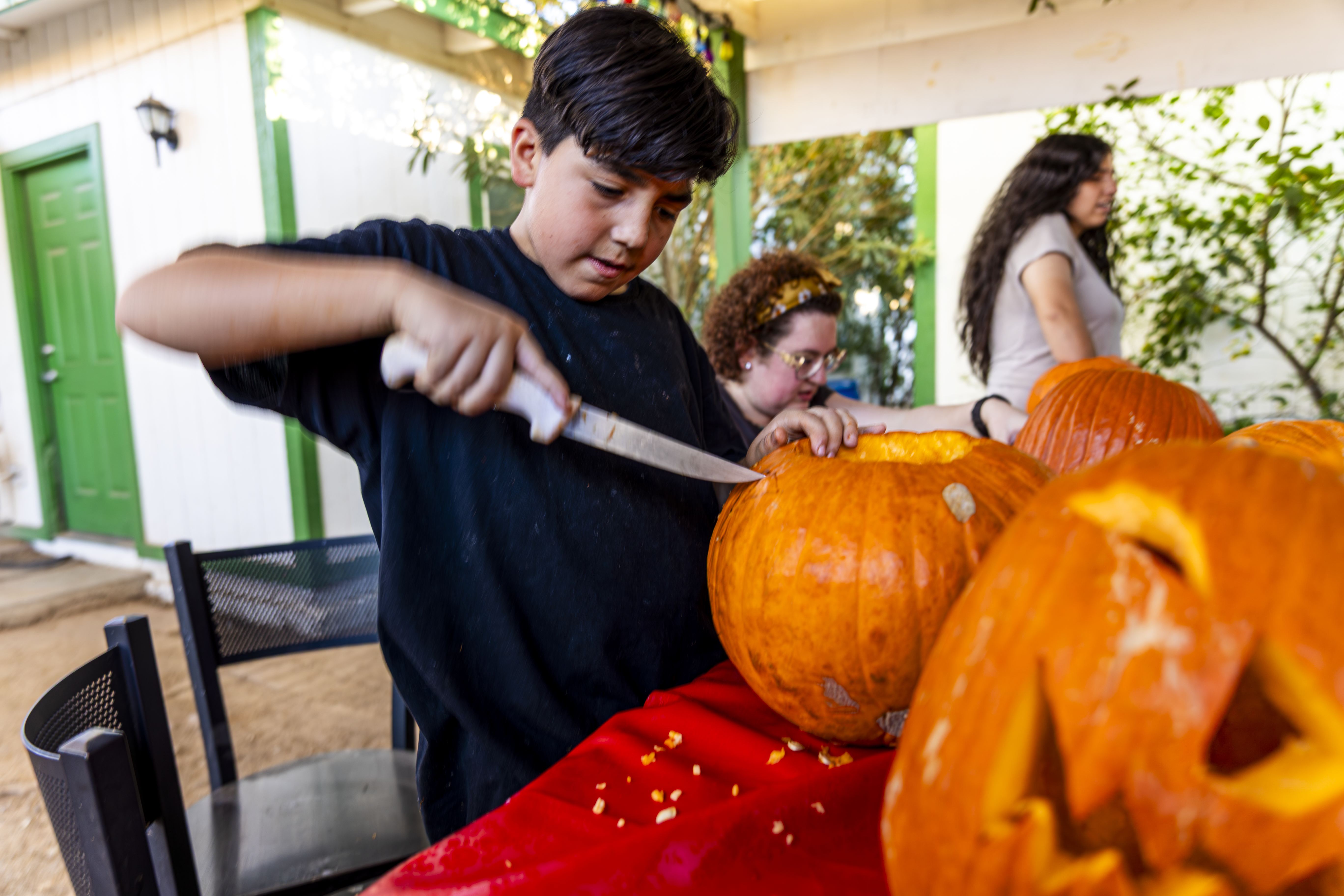 When I got up it was time to start organizing. I got a vinyl tablecloth onto the outside table and we had all the pumpkins ready by the time Laurent arrived – with more knives, thankfully! From there the fun began, and it went surprisingly easily. Even Ruben did a great job with all the carving on his own pumpkin! Paul, Jacob, Efrain, and Natalie did not participate for various reasons, and there was one pumpkin that had already gone soft on the bottom, but with Laurent joining in we ended up carving 7 of the 9 available gourds, and I think they looked terrific!