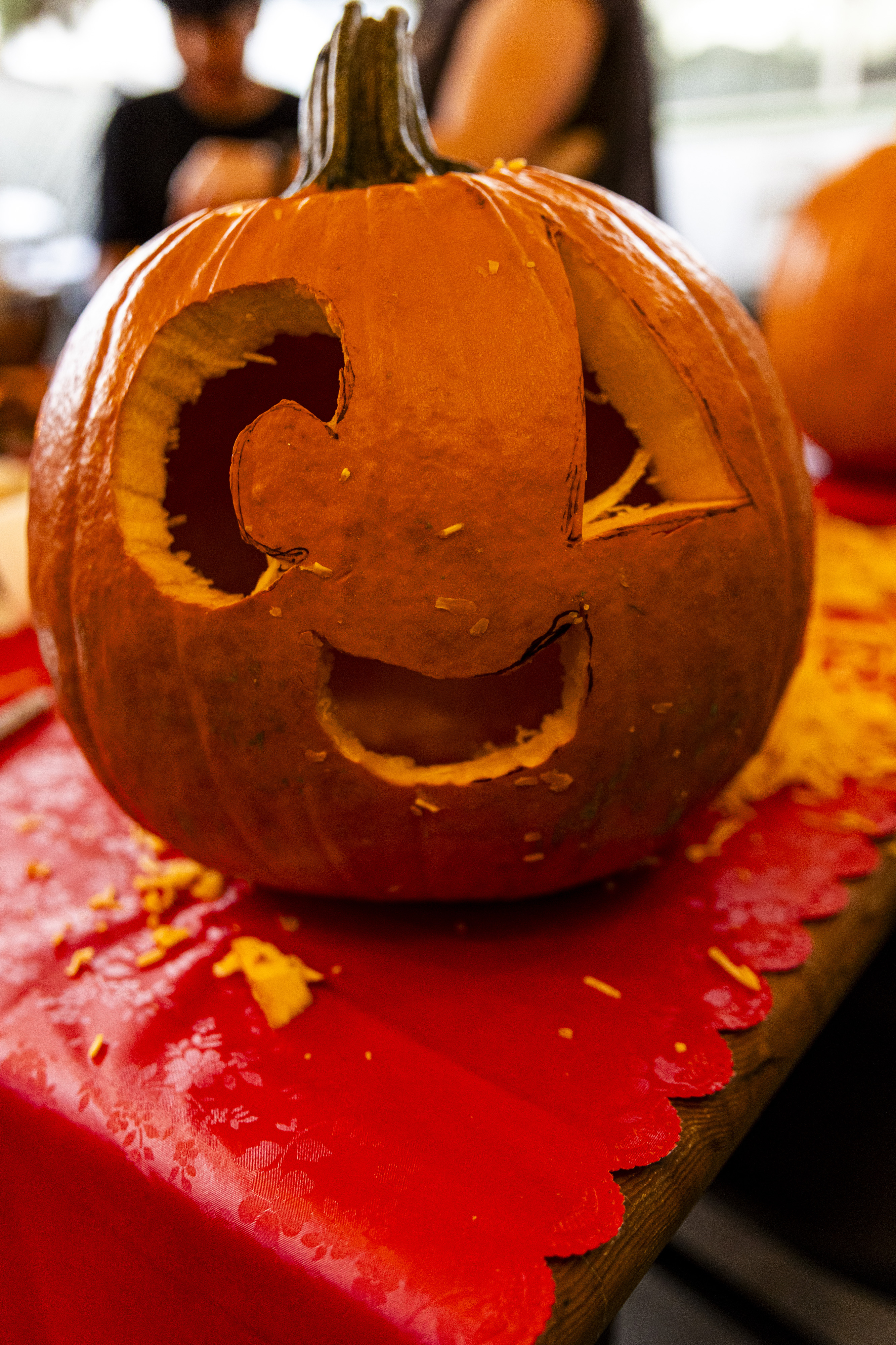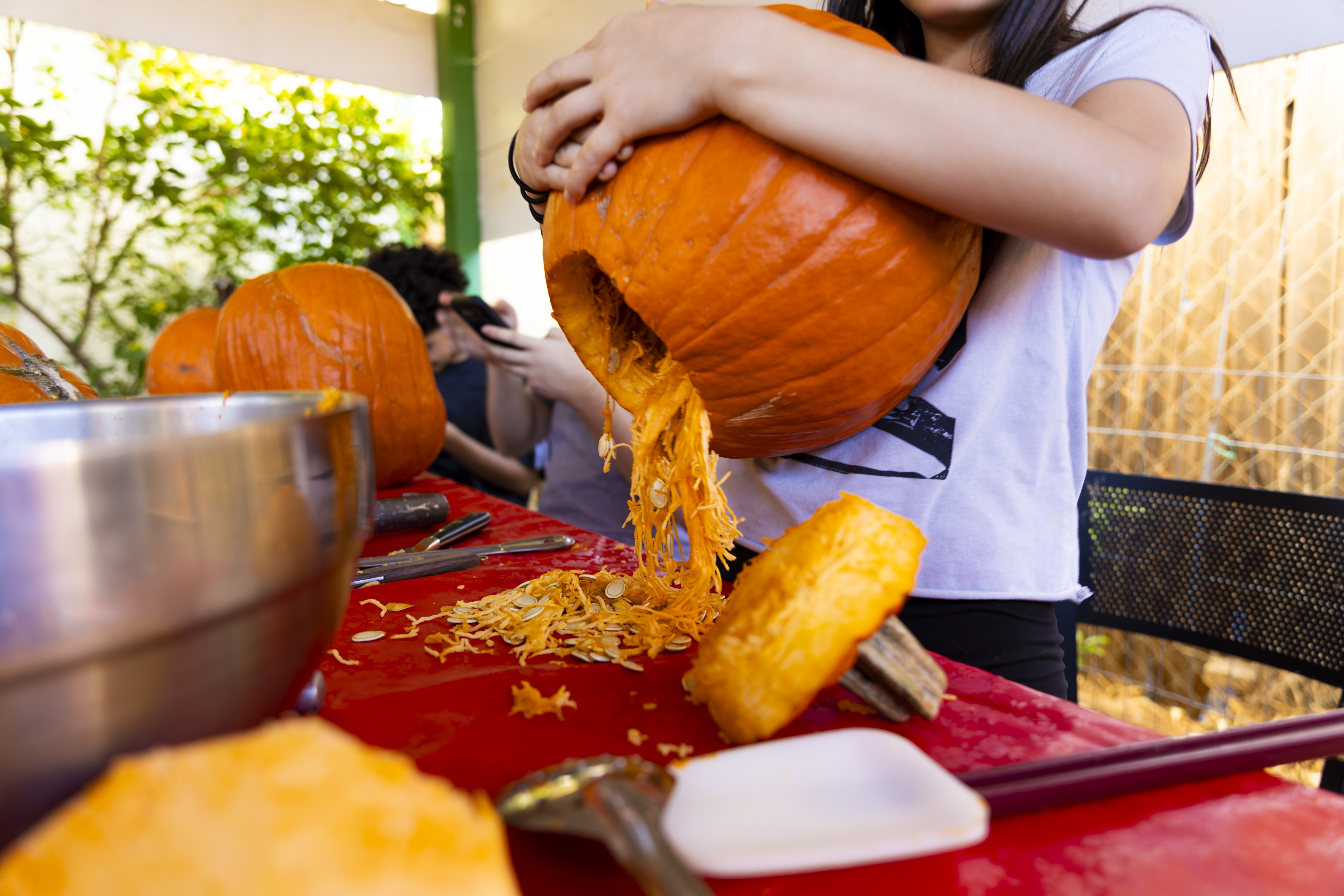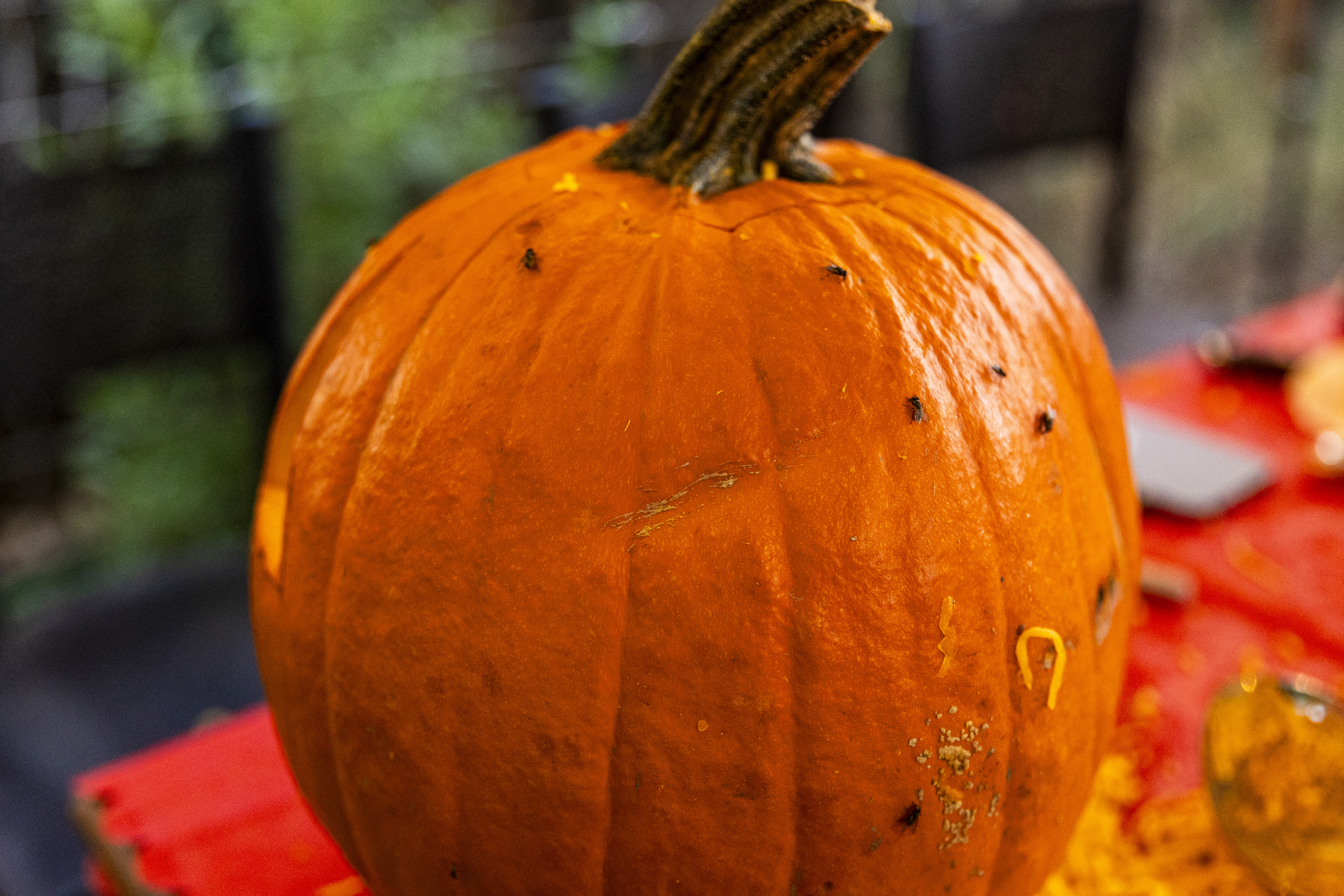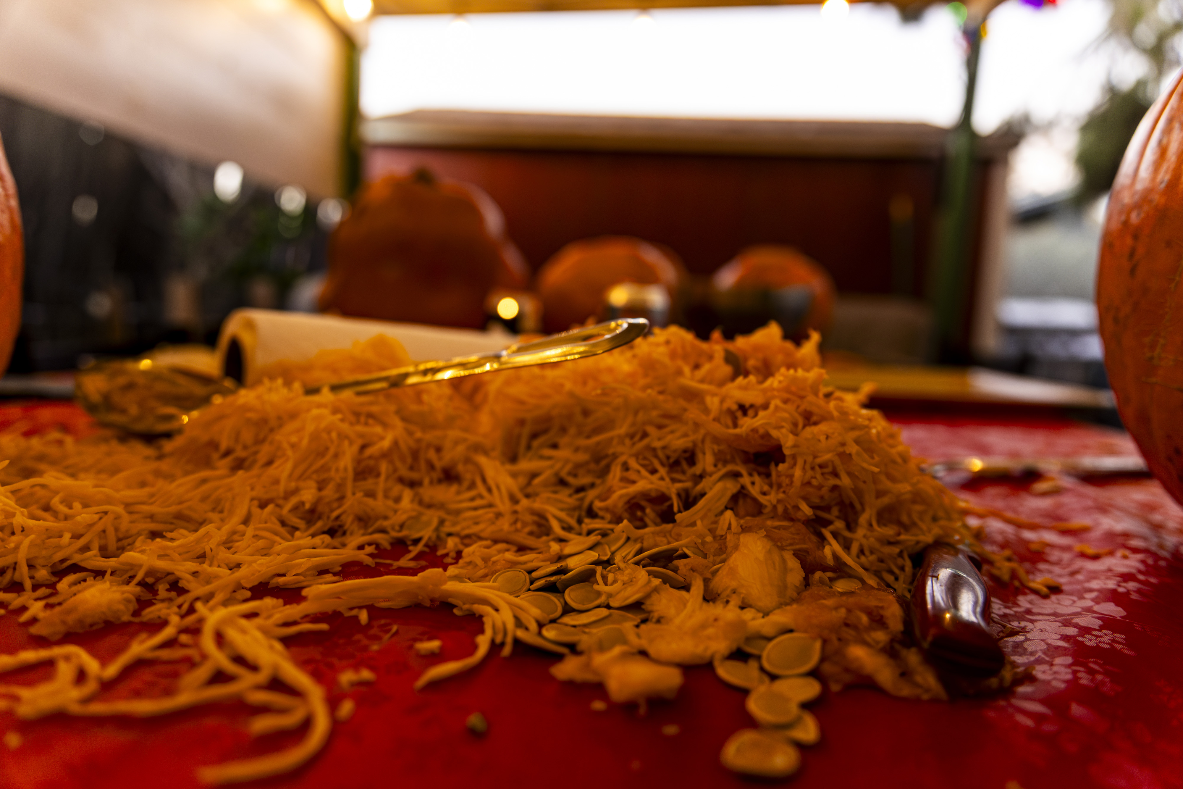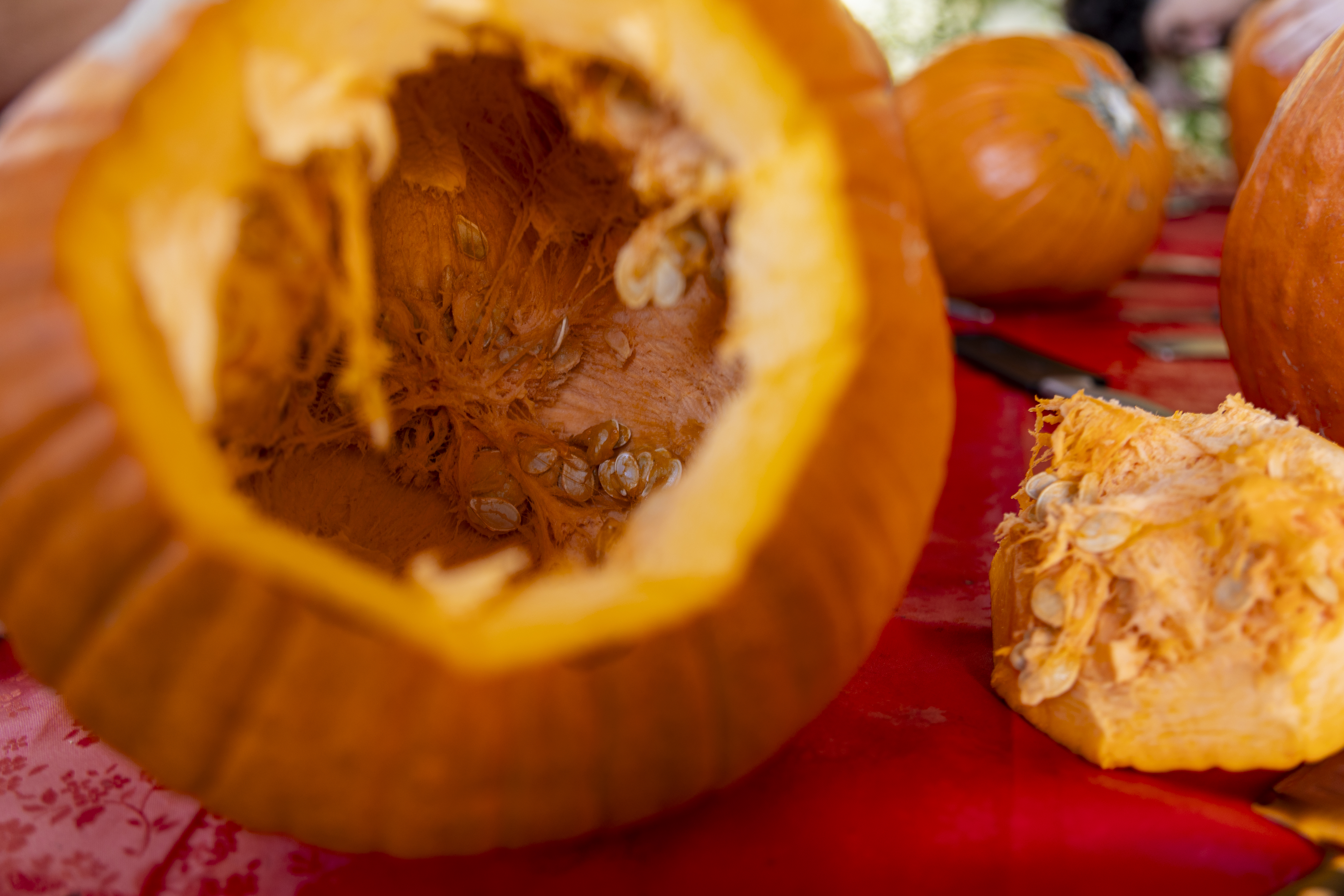 When I got up it was time to start organizing. I got a vinyl tablecloth onto the outside table and we had all the pumpkins ready by the time Laurent arrived – with more knives, thankfully! From there the fun began, and it went surprisingly easily. Even Ruben did a great job with all the carving on his own pumpkin! Paul, Jacob, Efrain, and Natalie did not participate for various reasons, and there was one pumpkin that had already gone soft on the bottom, but with Laurent joining in we ended up carving 7 of the 9 available gourds, and I think they looked terrific!
