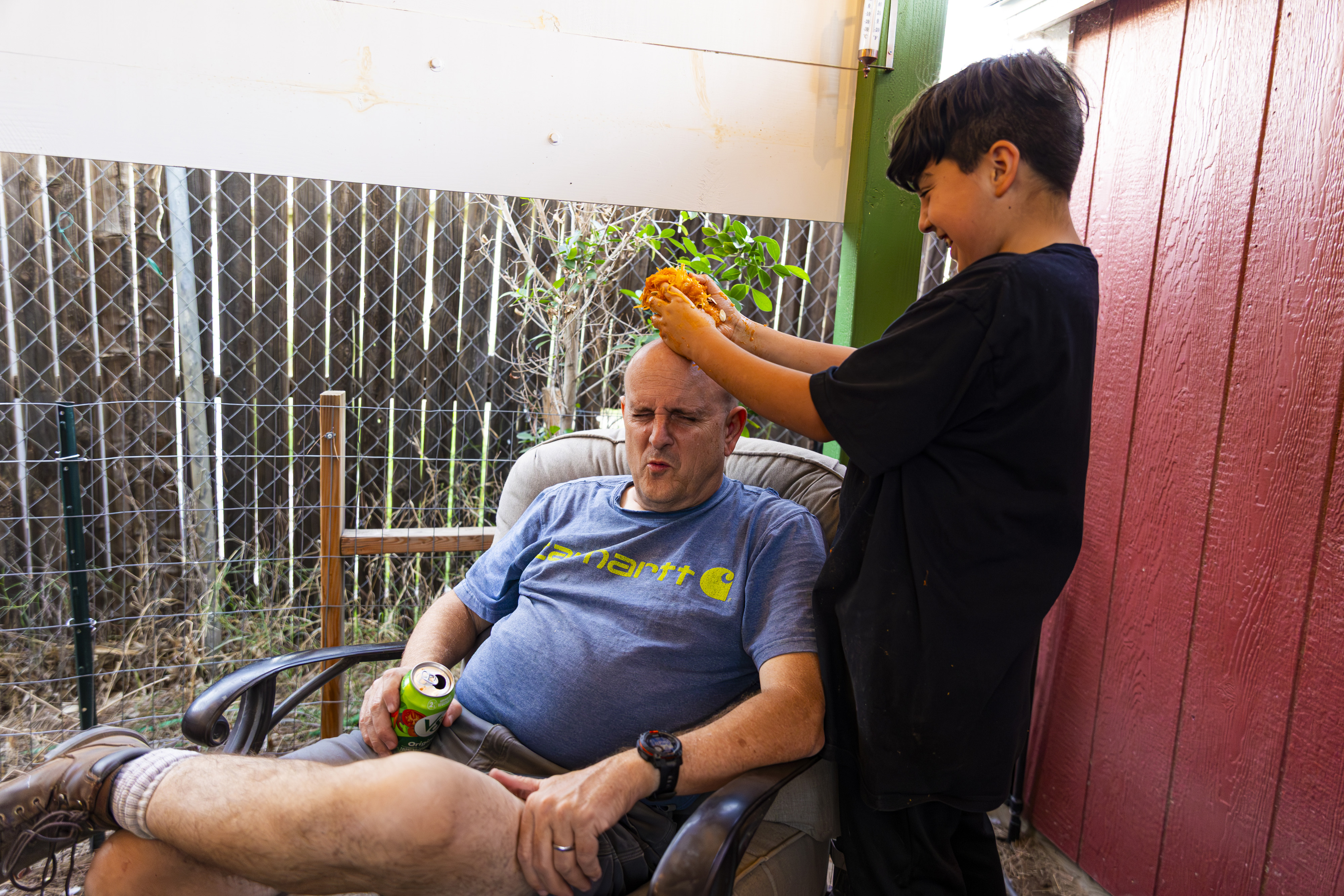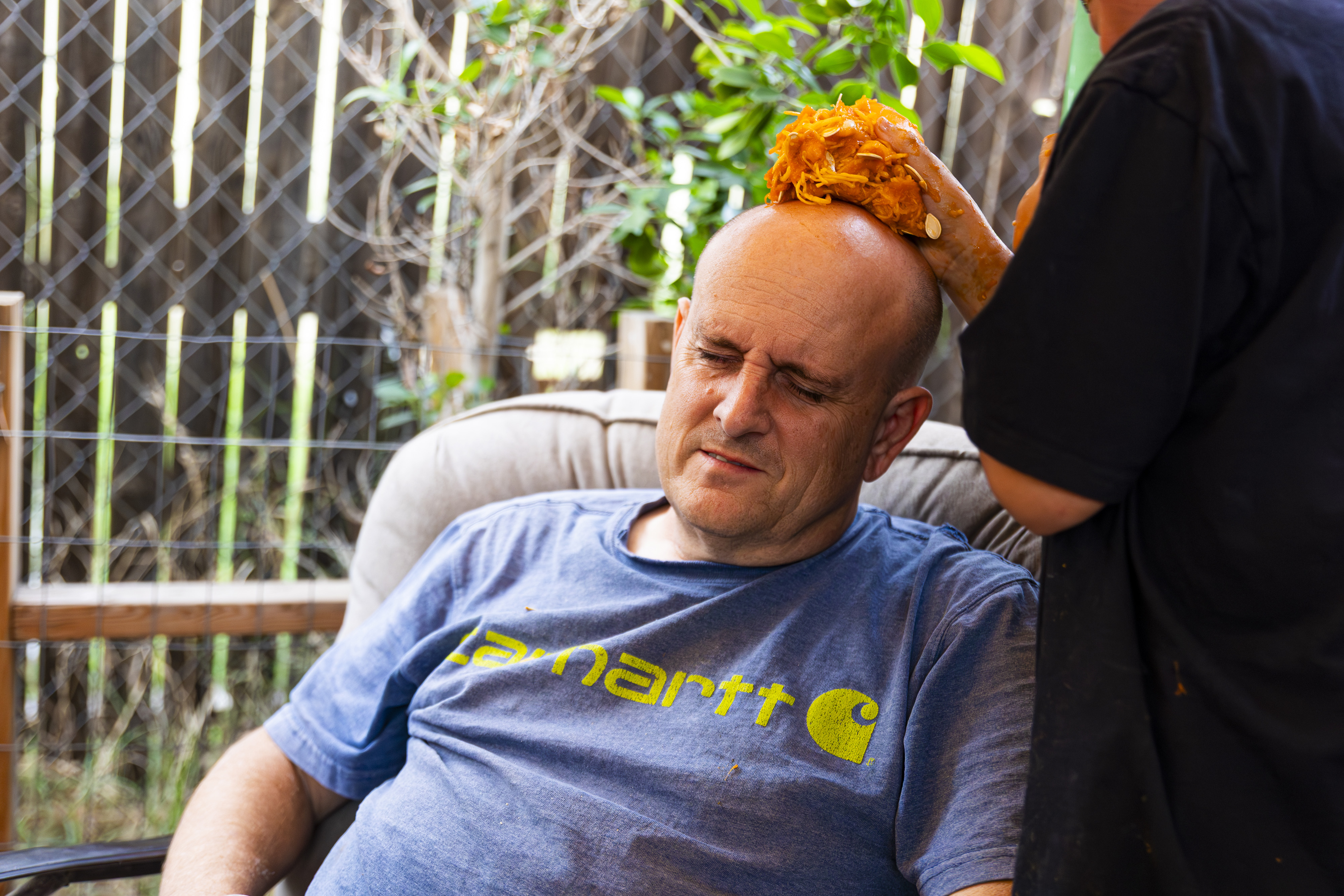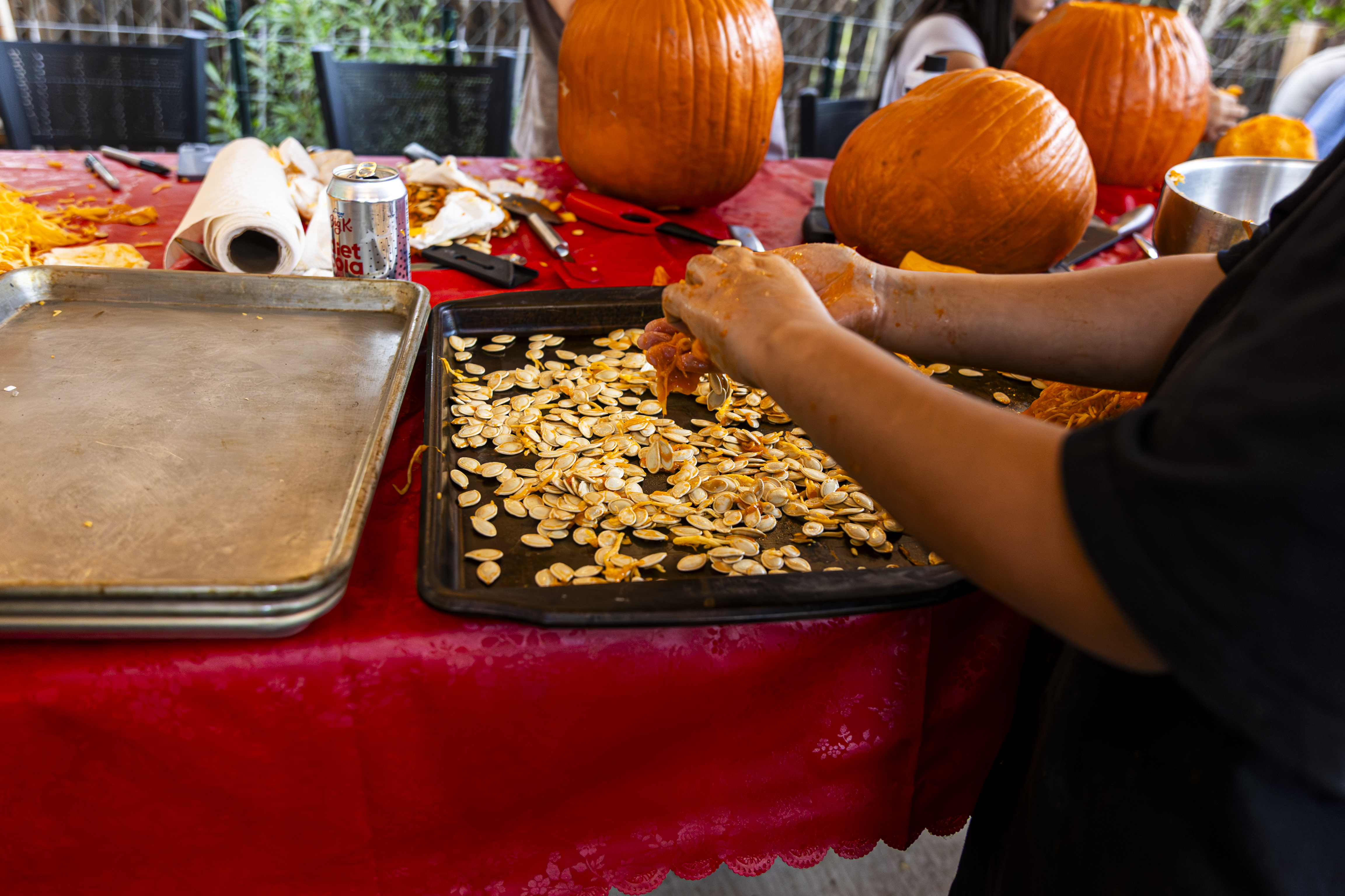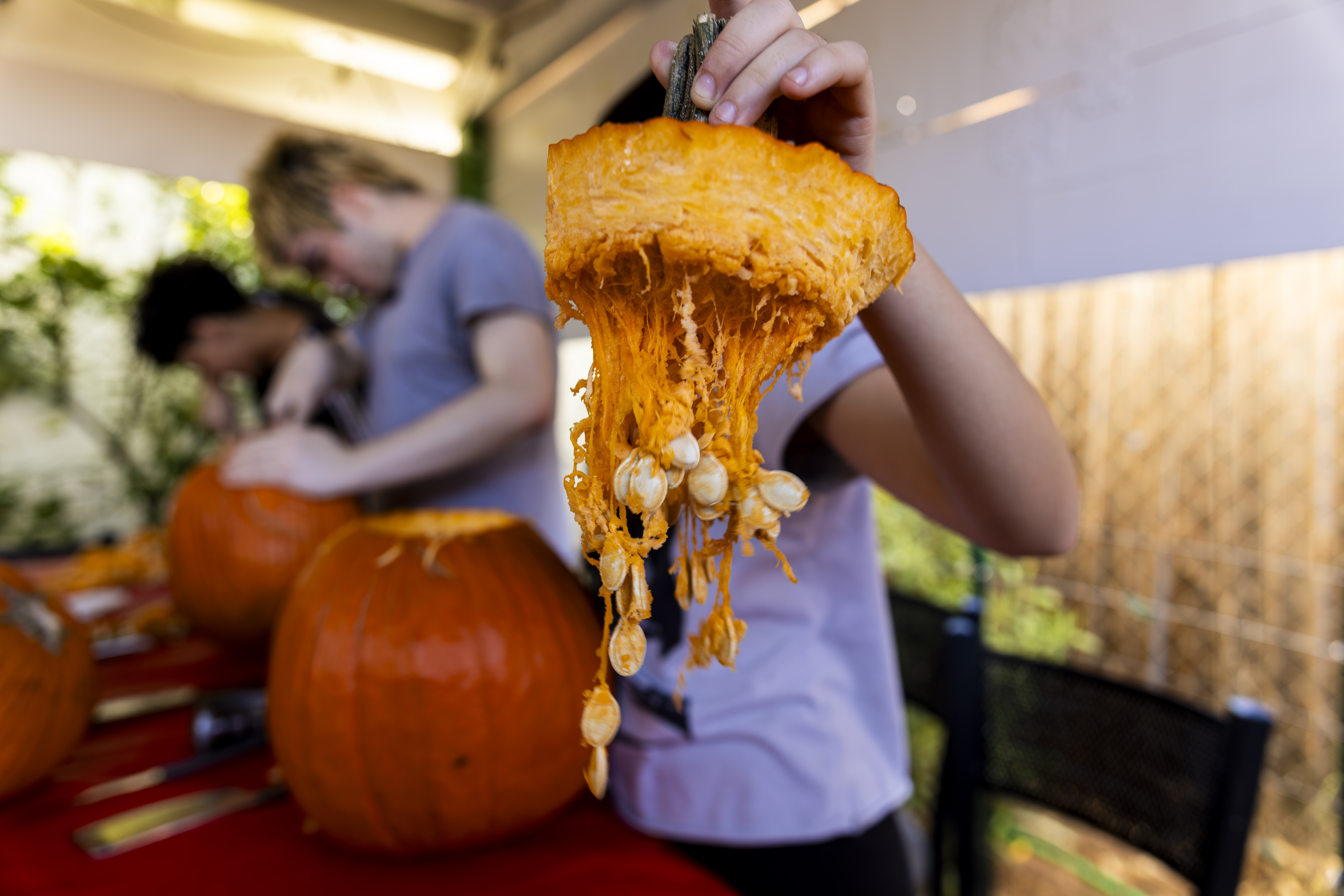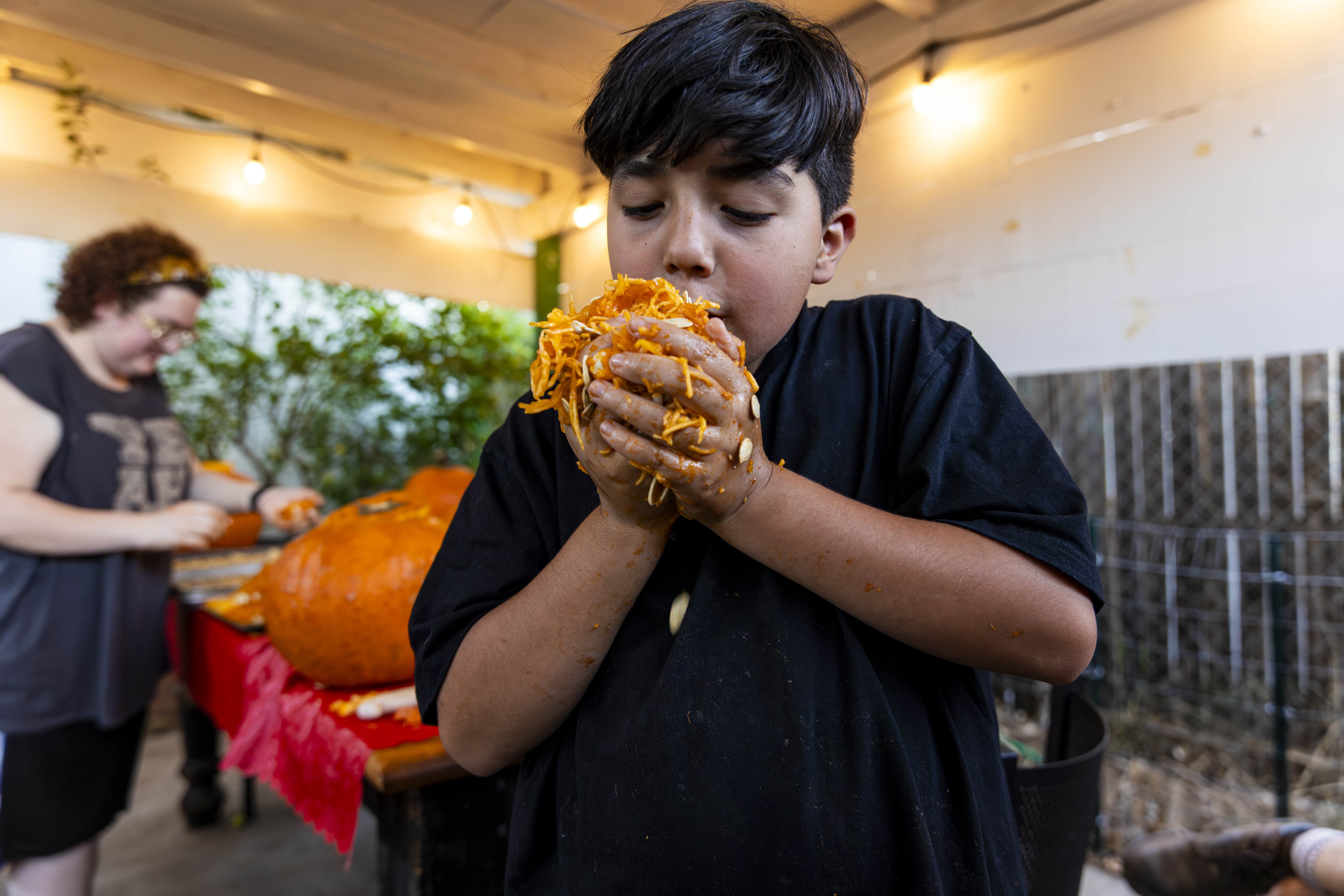When I got up it was time to start organizing. I got a vinyl tablecloth onto the outside table and we had all the pumpkins ready by the time Laurent arrived – with more knives, thankfully! From there the fun began, and it went surprisingly easily. Even Ruben did a great job with all the carving on his own pumpkin! Paul, Jacob, Efrain, and Natalie did not participate for various reasons, and there was one pumpkin that had already gone soft on the bottom, but with Laurent joining in we ended up carving 7 of the 9 available gourds, and I think they looked terrific!