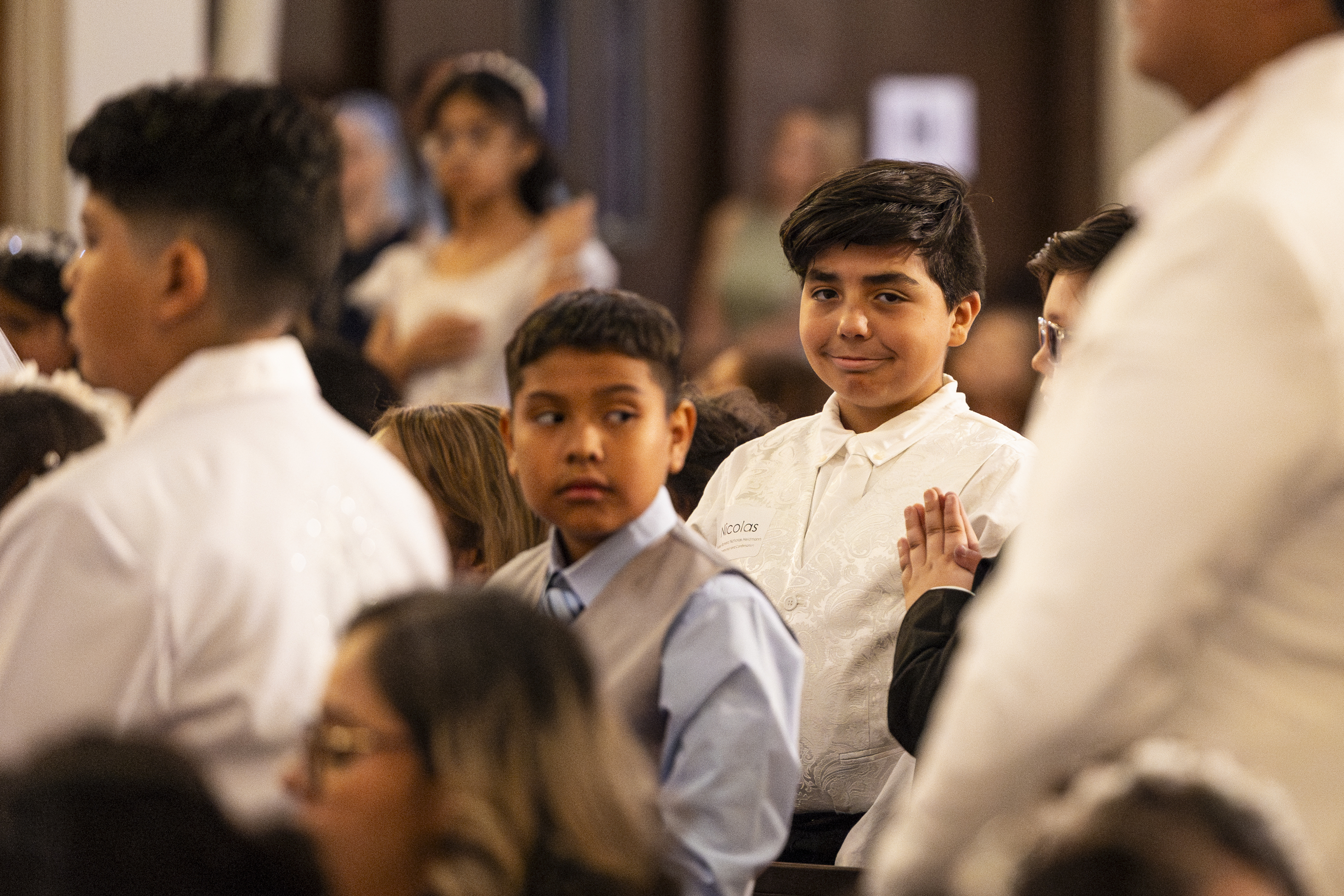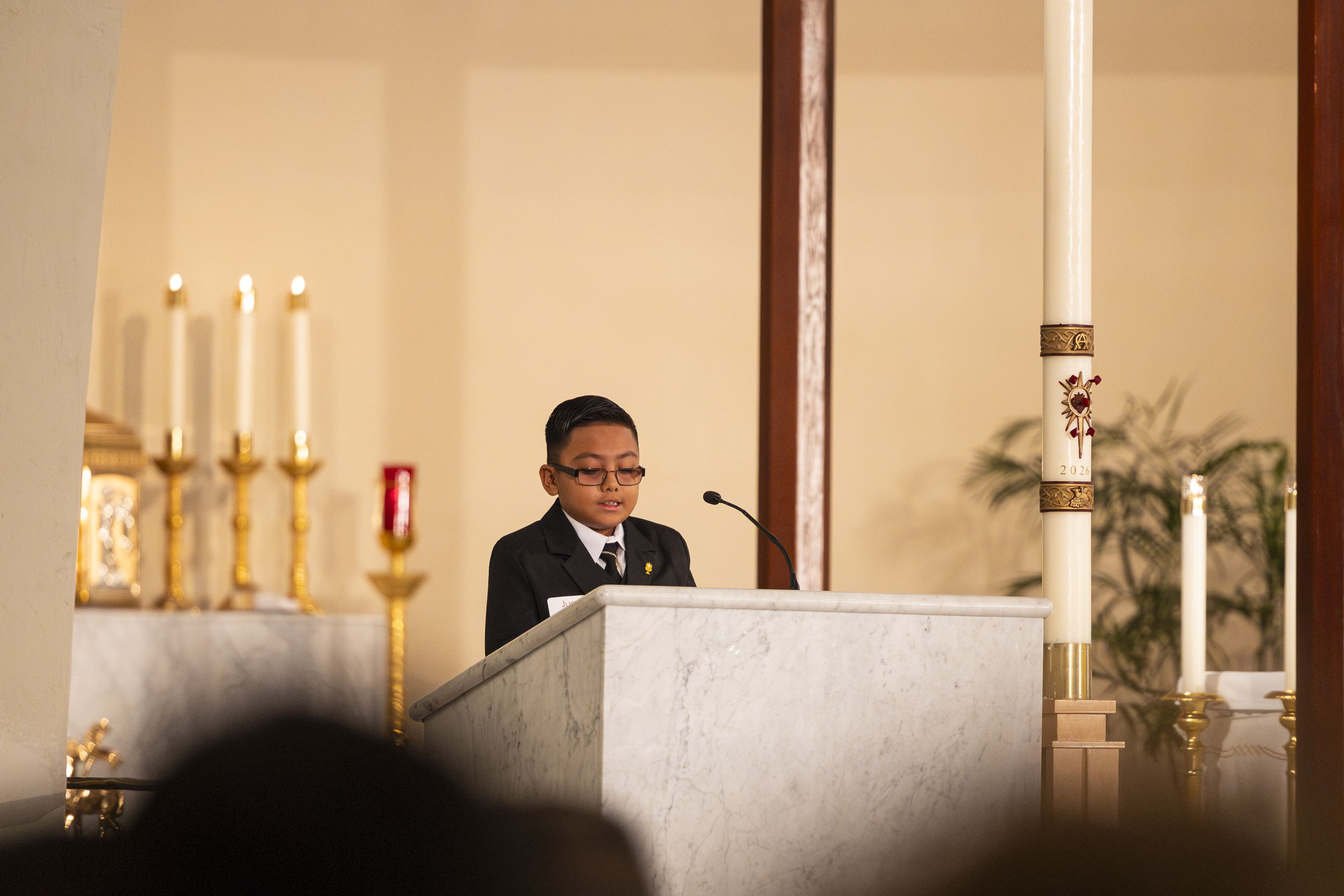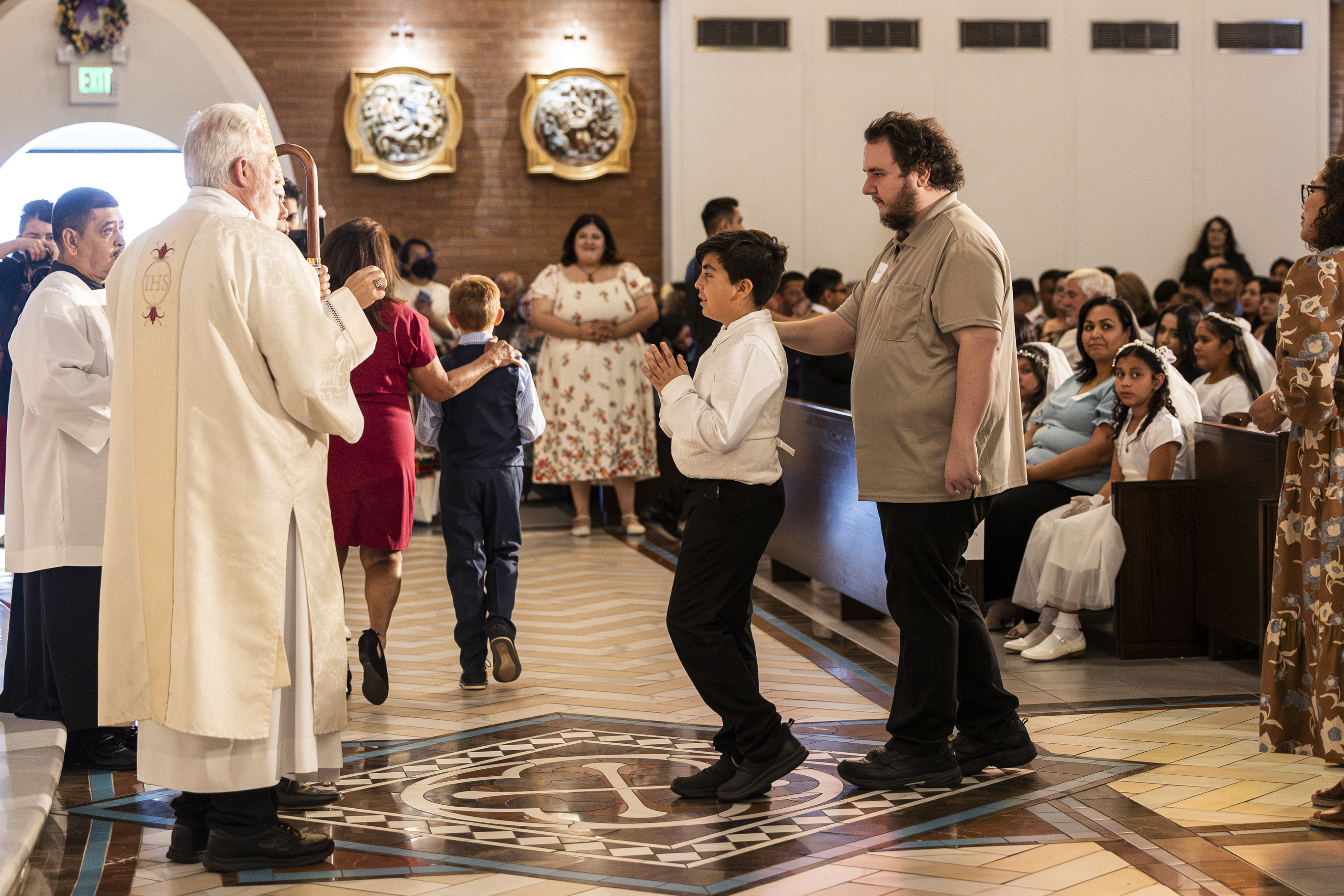 Mass was scheduled to begin at 10am. We arrived shortly after 9am, and Paul was just a few minutes before us. Even at that he was barely early enough to save the one seat I wanted. I knew I needed to be able to get up to the front at the right moment to get photos (among the throngs of parents vying for a prime spot) but because my walking is so limited, I needed to have my wheelchair parked in the handicapped spot right on the outside aisle on whichever side Ruben would be seated. Got the spot, and the two seats next to it in the pew for Paul and Ellie, and then it was just a matter of waiting for everything to get started.