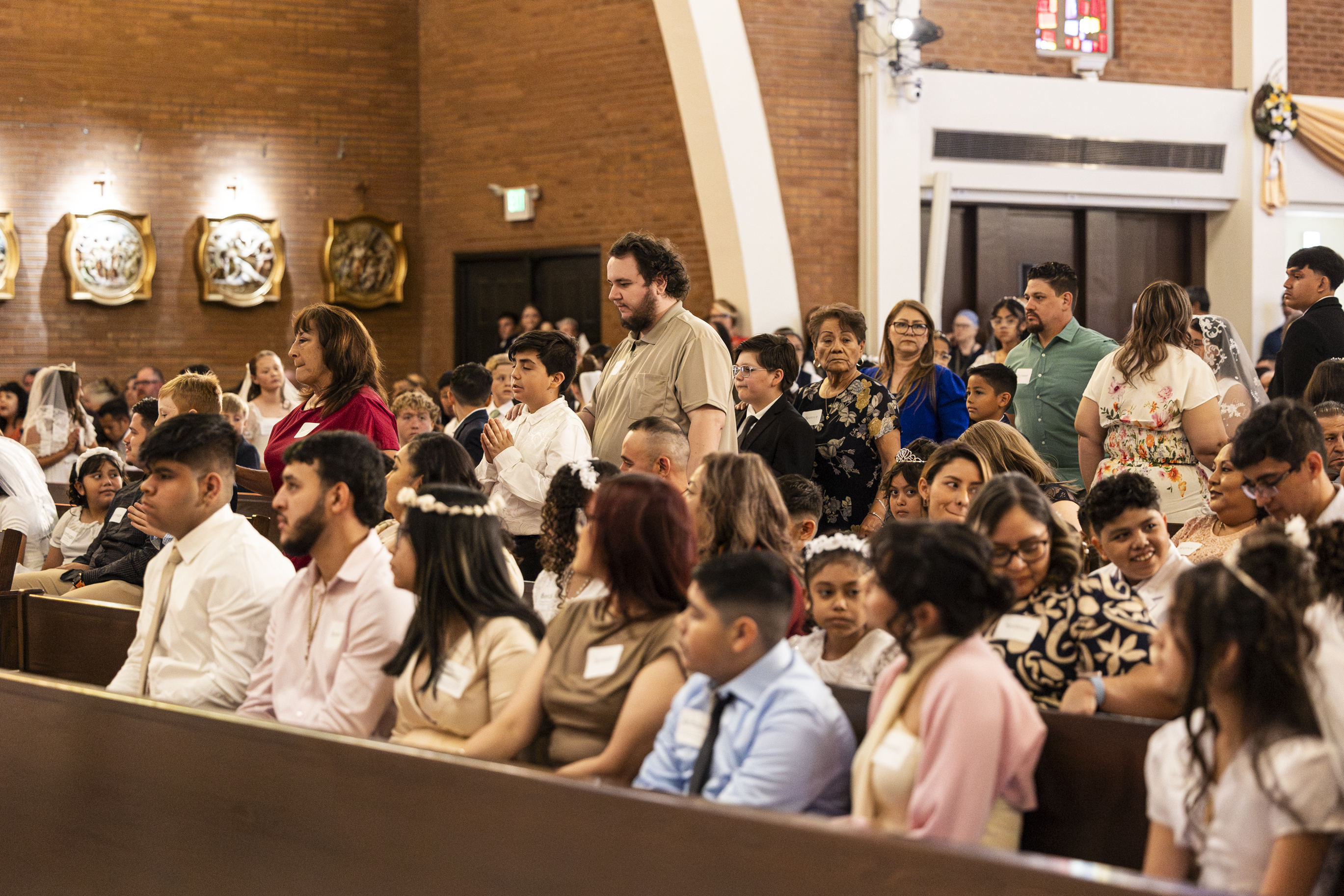 The church filled quickly, and by two minutes to 10am people were sitting shoulder to shoulder in every row, and every aisle and the narthex were filled with standing congregants. It was actually a good thing that no more of our clan was able to be there, it would have taxed the already over-filled seating to much. (To be clear, this mass of sacraments was only one of three to be held at our church this year – in addition to everyone who was baptized and confirmed at the Easter Vigil!)